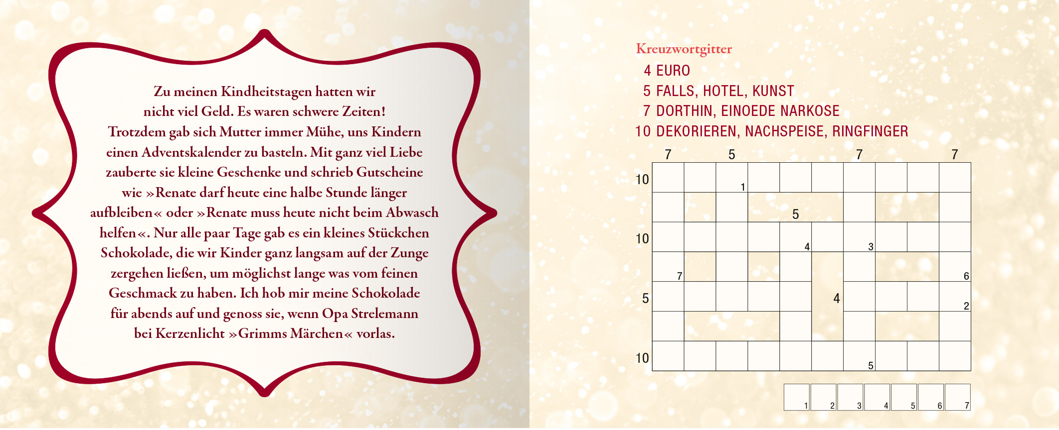 Weihnachtliche Knobelchallenge: Rätsel-Adventskalender von Renate BergmannDie beliebte Online-Omi bringt auch dieses Jahr wieder unsere Gehirnzellen zum Glühen. Mit 24 Rätseln und Renate Bergmanns Wortwitz vergeht die Zeit bis Weihnachten garantiert schnell. Ob Buchstabensalat, Labyrinth, Quiz, Schwedenrätsel, Wortrad oder Kreuzwortgitter - Renate Bergmann hat für jeden Dezembertag eine Rätselaufgabe vorbereitet. Einfach die entsprechende Seite aufschneiden und los geht"s. Mit viel Humor und Rätselspaß durch die Weihnachtszeit: Trainieren Sie mit Renate Bergmann ihre grauen Zellen und Lachmuskeln!Adventskalender für Rätselfreunde: 24 Worträtsel und Buchstabenspiele, eingebunden in eine weihnachtliche Renate-Bergmann-GeschichteGeistig fit durch den Advent: 9 Rätselarten sorgen für Abwechslung beim Knobeln und TüftelnRätselspiel für jeden Tag im Advent: Das Geschenk für alle Superhirne, Rätselfreaks und Abenteurer - nicht nur was für Rentner:innen wie Rena