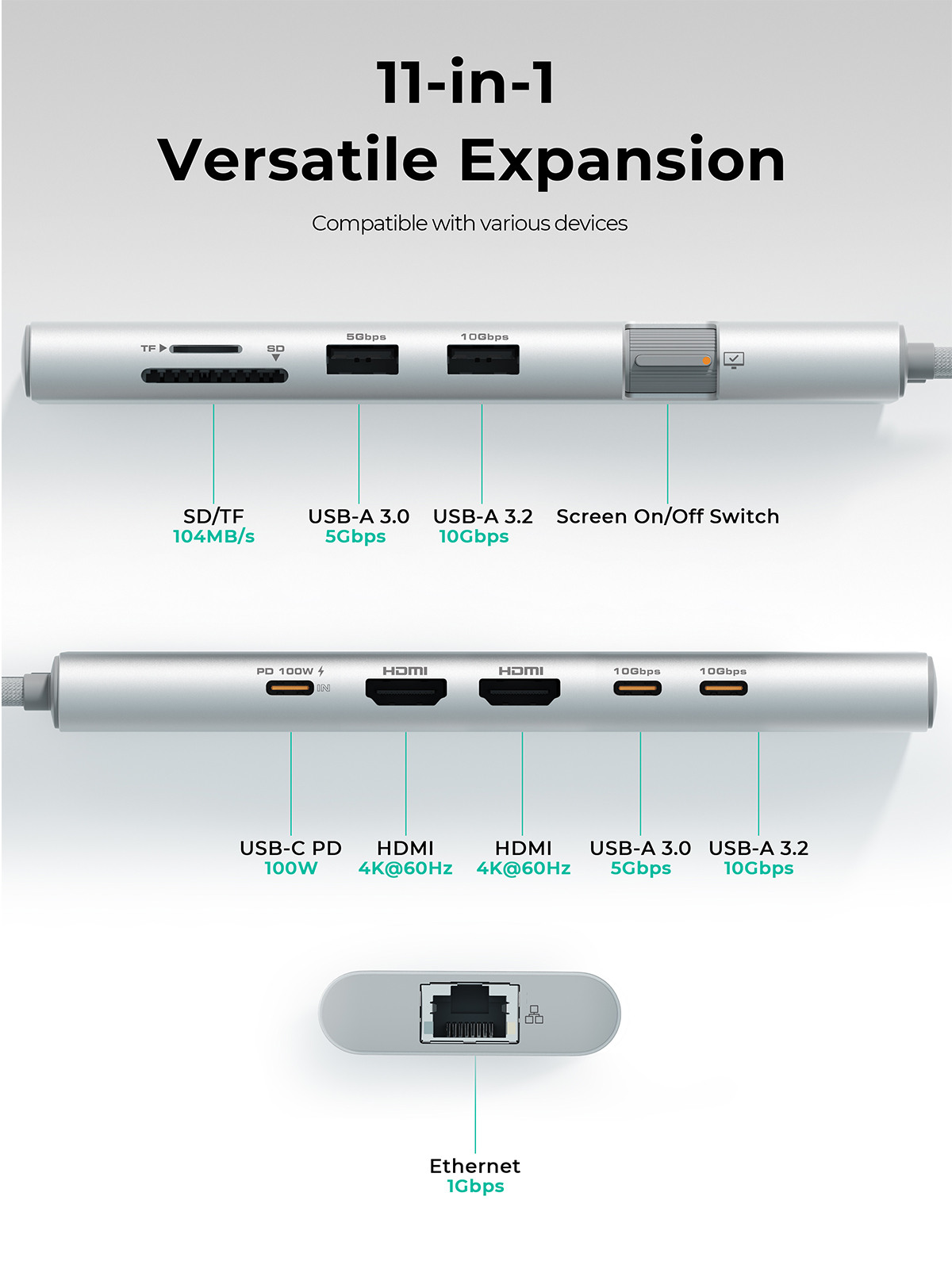 4K@60HzVideo: Dieser Hub wurde für eine schnelle und stabile Signalübertragung entwickelt und sorgt dafür, dass Ihre 4K-Inhalte mit flüssigen 60 Hz wiedergegeben werden, was ein beeindruckendes Seherlebnis garantiert.