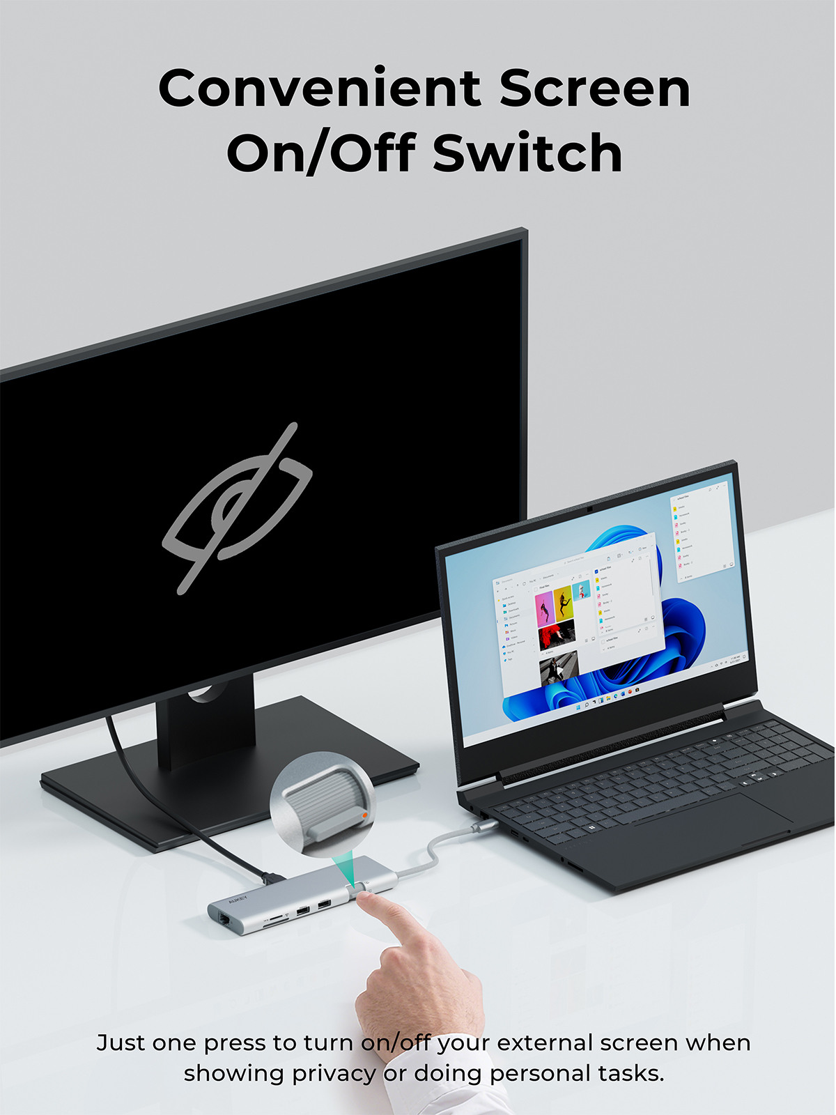- Praktischer Ausschaltknopf: Der Hub verfügt über einen Ausschaltknopf, mit dem Sie Ihren gespiegelten/erweiterten Bildschirm sofort ausschalten können, um Ihre Privatsphäre bei Besprechungen zu schützen.
