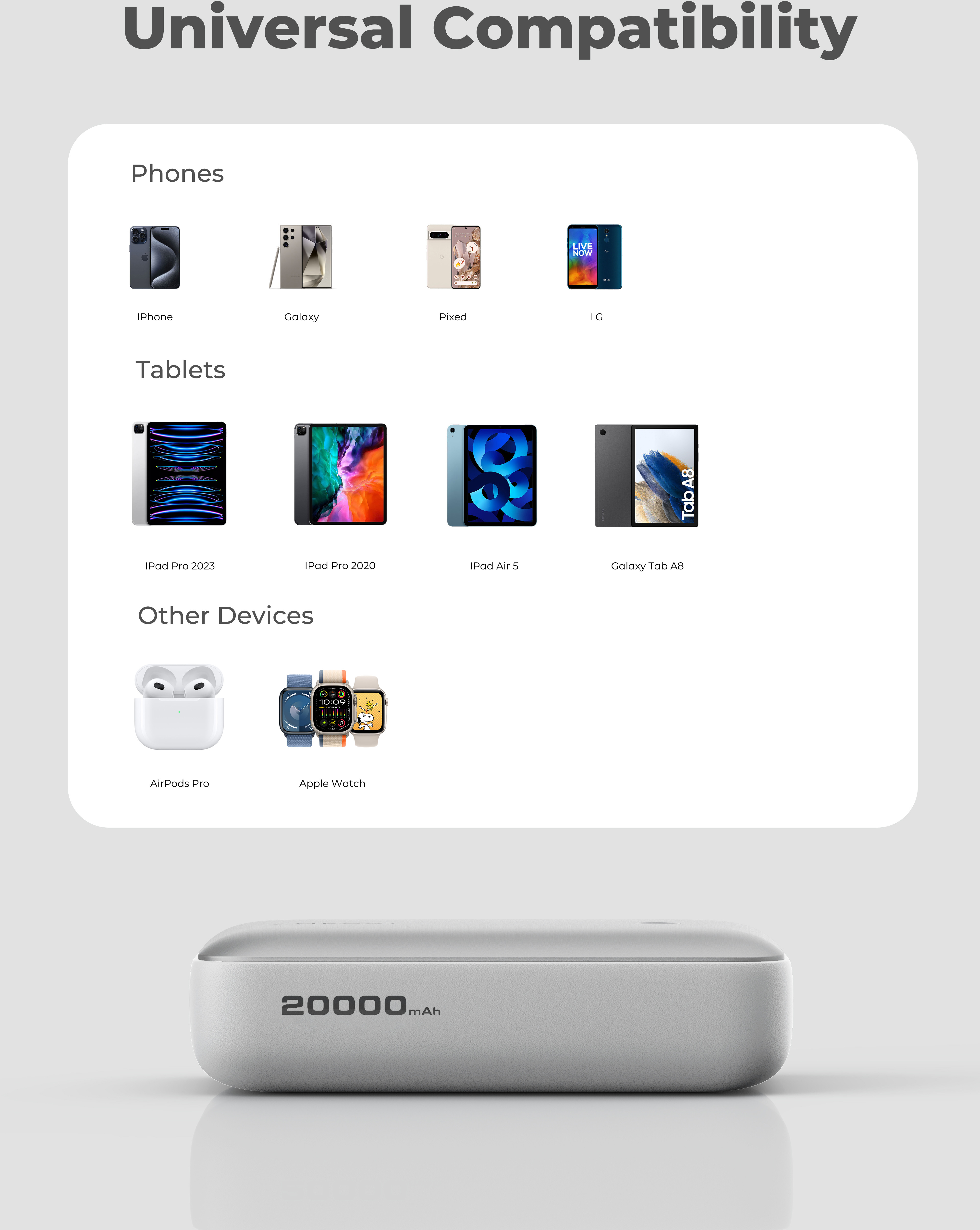 - Hohe Kapazität: Mit einer beeindruckenden Kapazität von 20000mAh, verpackt in einem kompakten Design, bietet diese Powerbank umfangreiche Ladefunktionen, mit denen Sie die meisten Smartphones mehrfach aufladen und unterstützt sogar grössere Geräte wie Tab