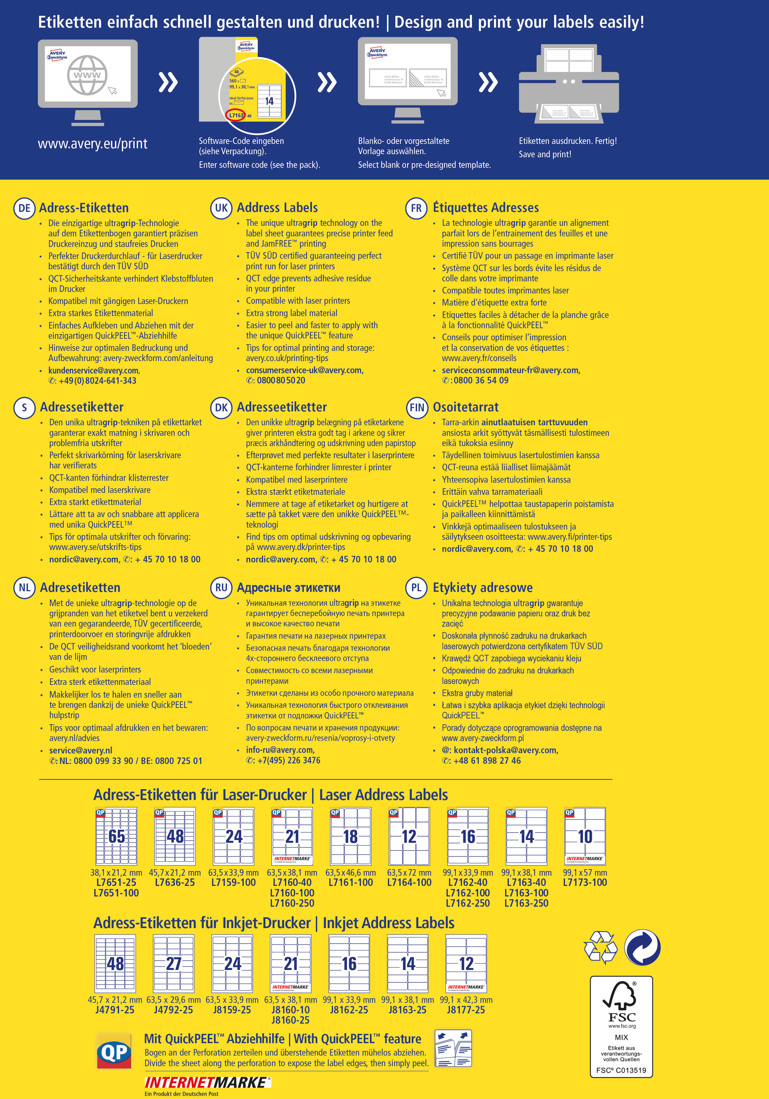 Qualität vom Etiketten-Experten: die weissen Adress-Etiketten L7162-40 für Laser-Drucker im Format 99,1 x 33,9 mm von Avery Zweckform eignen sich z.B. zum Adressieren von DIN lang Kuverts. 640 Adress-Etiketten pro Packung auf 40 Bogen. ultragrip® macht ultra-effizient: die innovative ultragrip®-Technologie mit dem spürbaren Profil auf dem Etikettenbogen gewährleistet einen ultra-präzisen und absolut staufreien Druckerdurchlauf. Geeignet für alle Laser-Drucker. Regelmässig überprüft und für Laser bestätigt durch TÜV Süd. Ideal auch für Seriendruck und grössere Druckaufträge. Die Etiketten lassen sich durch die zusätzliche QuickPEEL-Abziehhilfe besonders einfach und schnell vom Bogen abziehen und aufkleben. So arbeiten Sie effizient wie stressfrei und schaffen sich wertvolle Zeit für die wirklich wichtigen Dinge. Ideen drucken – einfach & professionell: mit Etiketten von Avery Zweckform können Sie den kostenlosen Online Etiketten-Designer unter www.avery.eu/print nutzen. Gestalten Sie Ihr Etikett mit der Software komplett selbst, verwenden Sie eine der Design-Vorlagen zu zahlreichen Themen, die Sie individuell anpassen können oder laden Sie Ihr fertiges Design hoch und drucken anschliessend standgenau aus. So schnell und einfach sorgen Sie für einen professionellen Auftritt.Think & Care - Avery Zweckform ist seit 2020 klimaneutral: die Treibhausgasemissionen des Standortes werden durch zertifizierte Klimaschutzprojekte ausgeglichen. Schon seit 2014 wird ausschliesslich Ökostrom/-gas verwendet. Forschung, Entwicklung, Produktion, Logistik und Verwaltung am Firmenstandort in Oberlaindern/Bayern garantieren höchste Qualitäts- und Umweltstandards sowie kurze Lieferwege. Das Obermaterial dieser chlorfrei gebleichten Etiketten wird zu 100% aus FSC®-zertifiziertem Papier aus verantwortungsvoll bewirtschafteten Wäldern hergestellt.