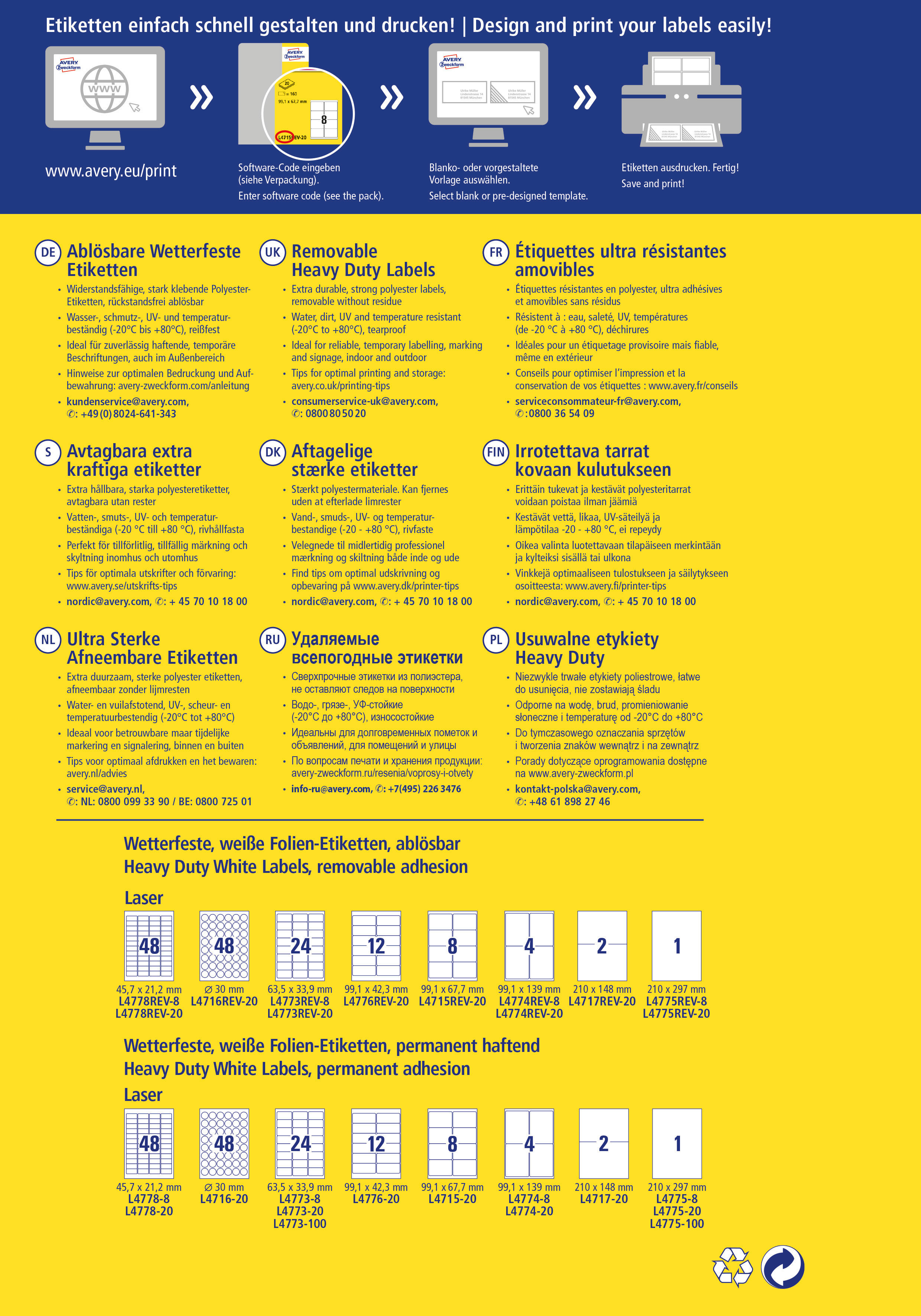 Qualität vom Etiketten-Experten: die ablösbaren, wetterfesten Etiketten L4776REV-20 im Format 99,1 x 42,3 mm für Laser-Drucker von Avery Zweckform zeichnen sich durch eine extreme Strapazierfähigkeit im Innen- und Aussenbereich aus. 240 matt beschichtete Folien-Etiketten aus Polyester auf 20 Bogen. Die Aufkleber haften sehr stark und sind dabei ablösbar, ohne Kleberückstände zu hinterlassen. Sie eignen sich dadurch besonders z.B. für die temporäre Kennzeichnung in Lager und Produktion, als Inventar- und Eigentums-Etiketten oder für Promotions und temporäre Produktbeschriftungen. Die reiss- und wasserfesten Folien-Etiketten sind deutlich strapazierfähiger als Papier-Etiketten, sie sind öl-, schmutz-, UV- und temperaturbeständig (-20° bis +80°C) und abwaschbar. Für alle gängigen Laser-Drucker geeignet. Ideen drucken - einfach & professionell: mit Etiketten von Avery Zweckform können Sie den kostenlosen Online Etiketten-Designer unter www.avery.eu/print nutzen. Gestalten Sie Ihr Etikett mit der Software komplett selbst, verwenden Sie eine der Design-Vorlagen zu zahlreichen Themen, die Sie individuell anpassen können oder laden Sie Ihr fertiges Design hoch und drucken anschliessend standgenau aus. So schnell und einfach sorgen Sie für einen professionellen Auftritt. Think & Care - Avery Zweckform ist seit 2020 klimaneutral: die Treibhausgasemissionen des Standortes werden durch zertifizierte Klimaschutzprojekte ausgeglichen. Schon seit 2014 wird ausschliesslich Ökostrom/-gas verwendet. Forschung, Entwicklung, Produktion, Logistik und Verwaltung am Firmenstandort in Oberlaindern/Bayern garantieren höchste Qualitäts- und Umweltstandards sowie kurze Lieferwege. Die Etiketten aus PVC-freier Folie werden klimaneutral hergestellt, die Emissionen des Materials werden kompensiert.