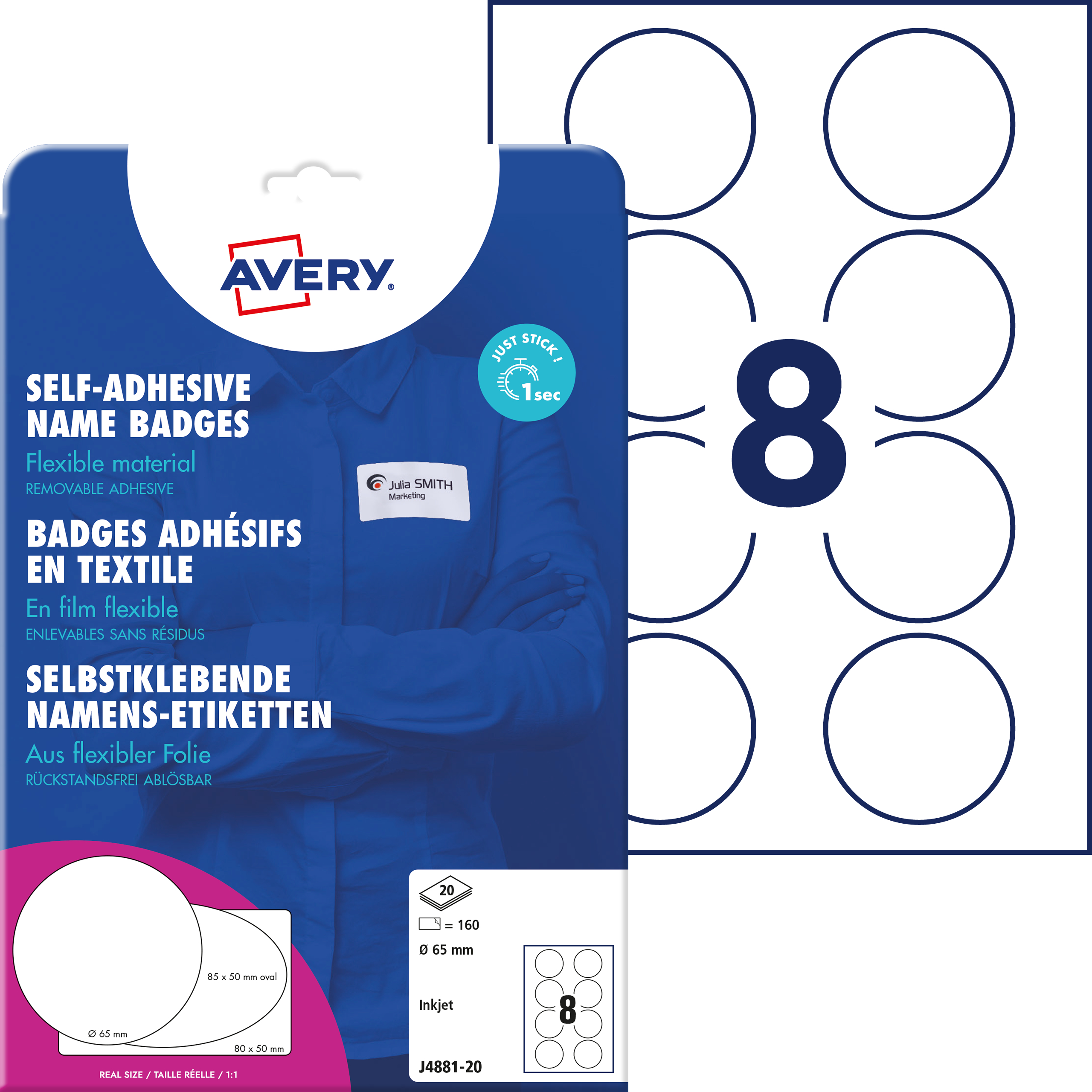 Qualität vom Etiketten-Experten: die selbstklebenden, ablösbaren Namens-Etiketten J4881-20 für Inkjet-Drucker von Avery Zweckform im runden Format Ø 65 mm erleichtern Ihnen die Organisation von Veranstaltungen, Seminaren und Konferenzen. 160 weisse, bedruckbare Namens-Etiketten auf 20 Bogen. Die runden Namensschilder aus flexiblem Folien-Material haften zuverlässig auf Kleidung und Textilien und lassen sich rückstandsfrei wieder ablösen. Die Rückseiten-Stanzung des Namensschilds erlaubt das Heraustrennen des Namens-Etiketts samt Trägerfolie für eine spätere Verwendung. Die Textil-Etiketten sind nicht geeignet für Leder, Seide, Samt und andere empfindliche Textilien. Die Namens-Etiketten bieten einen garantiert staufreien Druckerdurchlauf auf allen gängigen Inkjet-Druckern. So arbeiten Sie effizient wie stressfrei und schaffen sich wertvolle Zeit für die wirklich wichtigen Dinge. Ideen drucken - einfach & professionell: mit Etiketten von Avery Zweckform können Sie den kostenlosen Online Etiketten-Designer unter www.avery.eu/print nutzen. Gestalten Sie Ihr Etikett mit der Software komplett selbst, verwenden Sie eine der Design-Vorlagen zu zahlreichen Themen, die Sie individuell anpassen können oder laden Sie Ihr fertiges Design hoch und drucken anschliessend standgenau aus. So schnell und einfach sorgen Sie für einen professionellen Auftritt. Think & Care - Avery Zweckform ist seit 2020 klimaneutral: die Treibhausgasemissionen des Standortes werden durch zertifizierte Klimaschutzprojekte ausgeglichen. Schon seit 2014 wird ausschliesslich Ökostrom/-gas verwendet. Forschung, Entwicklung, Produktion, Logistik und Verwaltung am Firmenstandort in Oberlaindern/Bayern garantieren höchste Qualitäts- und Umweltstandards sowie kurze Lieferwege. Die Namens-Etiketten aus PVC-freier Folie werden klimaneutral hergestellt, die Emissionen des Materials werden kompensiert.