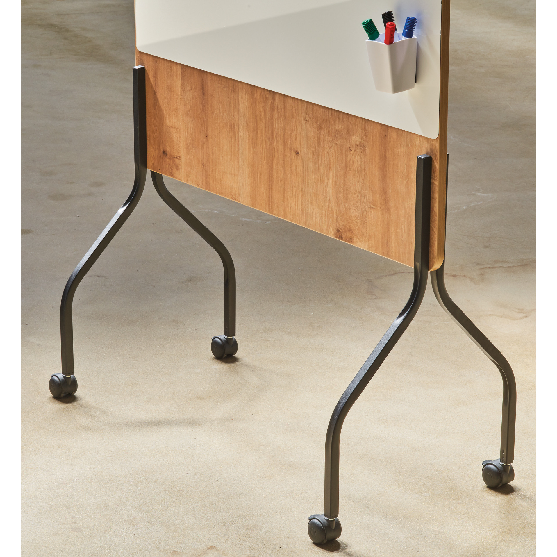 Das Kombiboard ist beidseitig magnethaftend, beschriftbar und trocken abwischbar. Rahmen in Holzoptik auf einem mobilen Stativ aus robustem Stahl mit 4 feststellbaren Rollen.