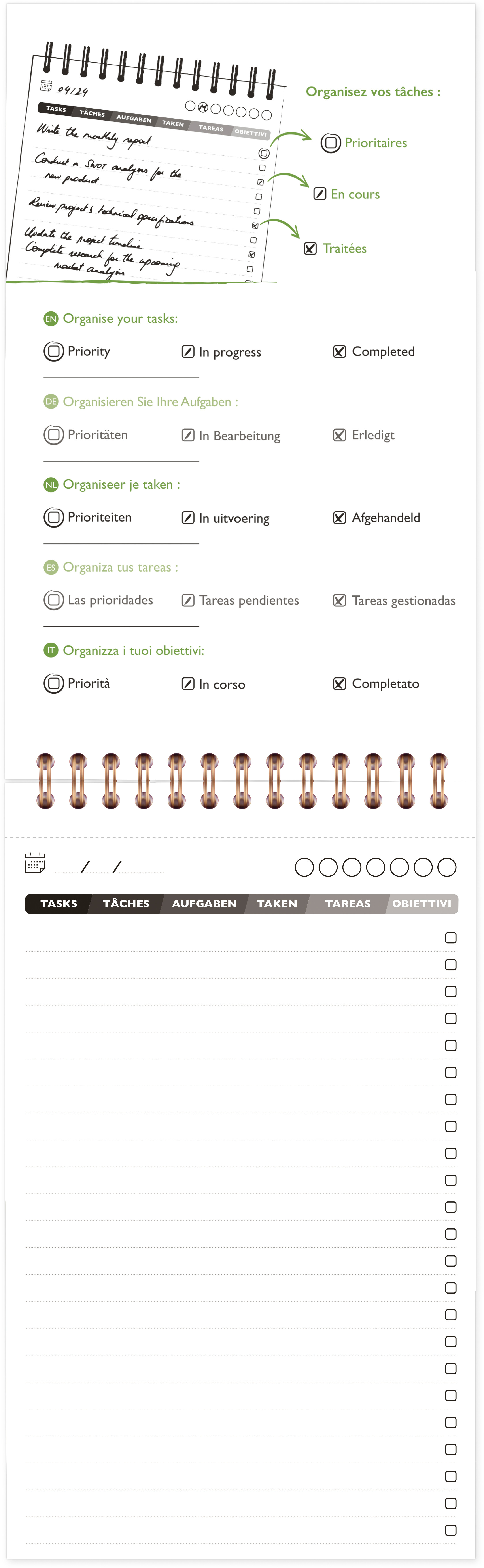 Der Block Age Bag- My.task.manager als Spiralblock 12x20 cm, mit 250 abtrennbare Seiten (125 Blatt) 90g, Rückseite punktkariert (dot) für die Organisation Ihrer Aufgaben: Tragen Sie die zu erledigenden Aufgaben ein und verfolgen Sie sie mit Hilfe der Kontrollkästchen für jede Aufgabe. Umranden Sie das Kästchen, wenn die Aufgabe Priorität hat, fügen Sie einen Strich hinzu, wenn die Aufgabe in Arbeit ist und einen zweiten Strich, wenn die Aufgabe bearbeitet wurde. Mit innen integriertem Aufsteller. Mit Gummizugverschluss auf dem Einband. Einband aus Karton, in der Masse gefärbt, gekörnt mit Lederstruktur: langlebig und widerstandsfähig. Samtweiches Velinpapier 90g von Clairefontaine, für ein einzigartiges Schreiberlebnis. Hergestellt in Frankreich. PEFC-zertifiziert für eine nachhhaltige Waldwirtschaft.