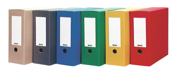 Biella Archivschachteln aus stabilem Karton für die Archivierung ihrer Unterlagen. Mit selbstklebendem Rückenschild für die individuelle Beschriftung. Mit praktischem Griffloch und Einsteckdeckel. Für Format A4.