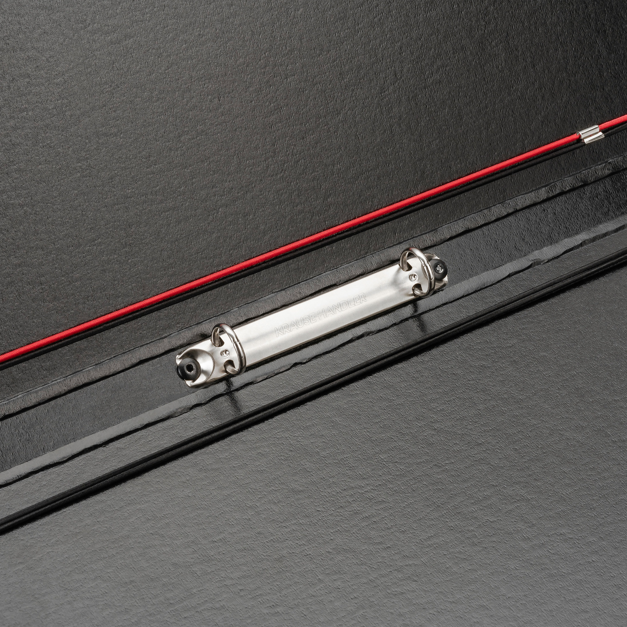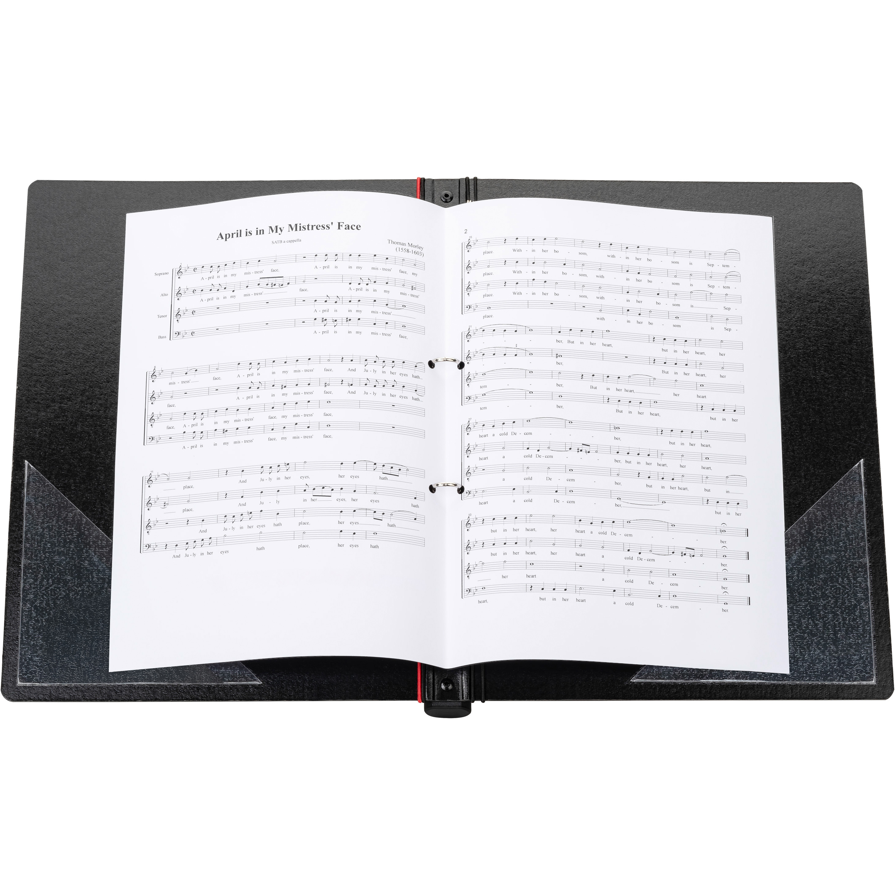 Chormappe aus hochwertiger schwarzer Pappe mit eleganter Nadelstreifenprägung aussen. Mit ergonomischem Haltegriff an der Rückseite und einer 2 Ring Mechanik sowie 4 Verschluss- und Haltegummis zur Sicherung der Notenblätter. Innen mit zwei Kunststofftaschen an den unteren Ecken, 360g leicht, FSC® zertifiziert ISBN 978-3-00-080949-1.