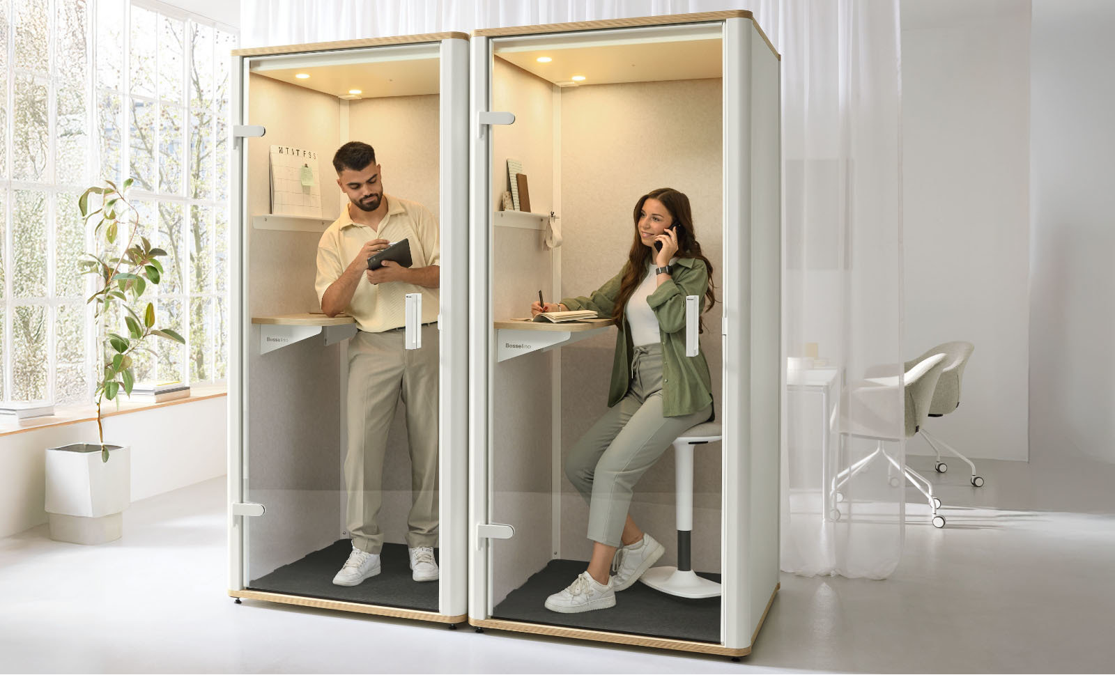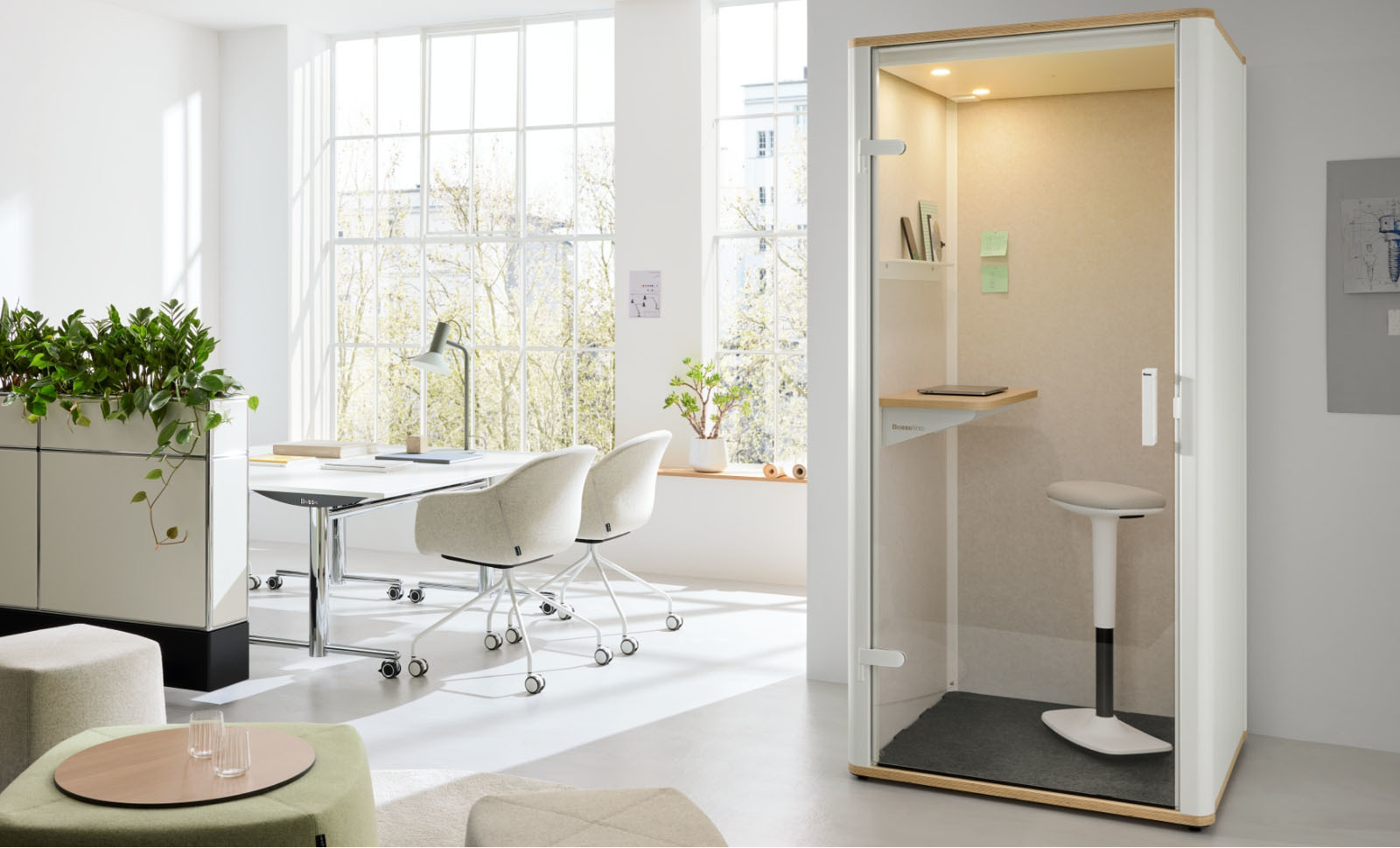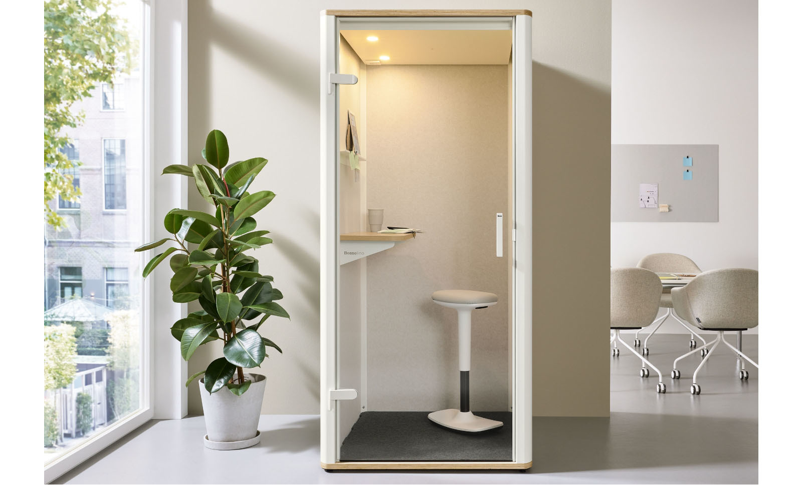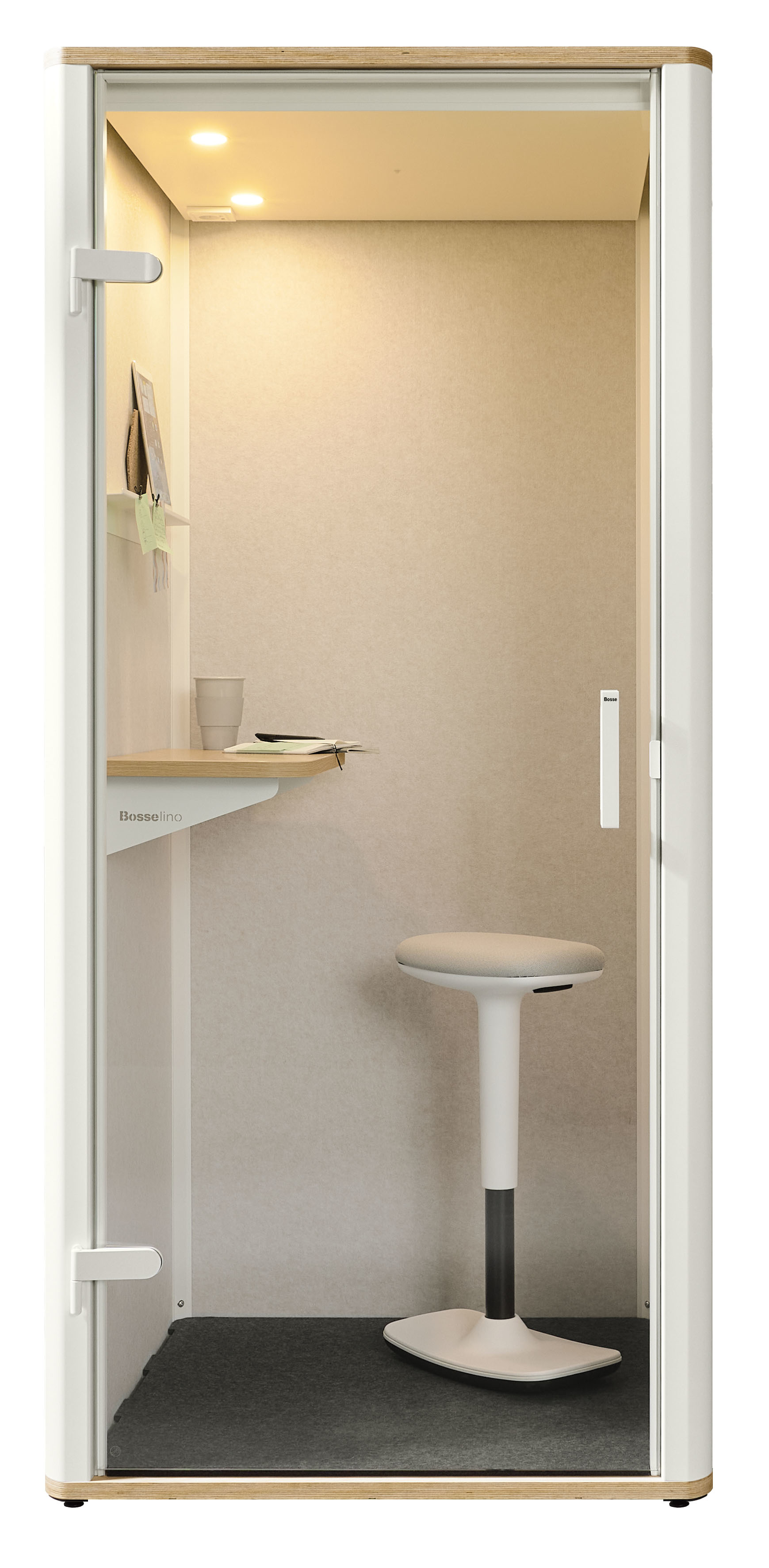 Noch nie ging Büro so kompakt. Der bosselino uno ist die ideale Callbox für Kommunikation, Kreativität und Auszeit. Schnell aufgebaut und aus hochwertigen, nachhaltigen Materialien gefertigt, vereint sie formvollendetes Design mit durchdachten Funktionen. Durchdacht, platzsparend und für ungestörtes Arbeiten gemacht: Der bosselino uno garantiert bequemes Arbeiten. Das Ablageboard bietet Platz für Laptop und Notizbuch und die Wandhalterung ermöglicht Videocalls auf Augenhöhe. Akustikpaneele aus 100 % recyceltem PET sorgen dafür, dass Umgebungsgeräusche draußen und vertrauliche Gespräche in der Box bleiben. Die blendfreie Beleuchtung und zwei geräuschlose Ventilatoren schaffen eine optimale Arbeitsatmosphäre. (Stehhocker ist nicht im Lieferumfang enthalten)