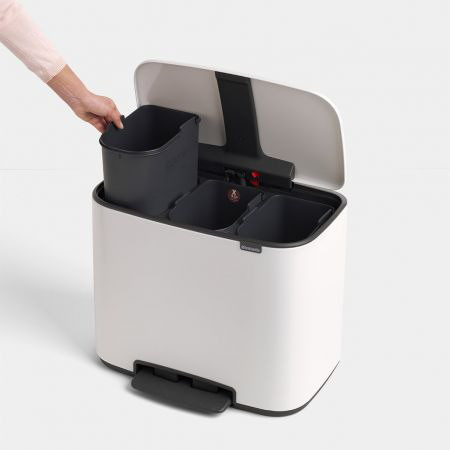 Sie suchen nach einer schönen Lösung für die Mülltrennung? Dieser Bo Treteimer von Brabantia hat es in sich. Entwickelt, um den Planeten und Ihr Zuhause schöner zu machen, mit drei Inneneimern mit einem Volumen von 11 Litern zum stilvollen Mülltrennen. Weitere Pluspunkte: ein platzsparendes Design und eine schützende, rutschfeste Standfläche, die für Stabilität sorgt und Ihren Boden schont. Der Deckel öffnet sich hygienisch durch leichtes Antippen mit dem Fuss und schliesst sich langsam. Das ist Trennen mit Stil!