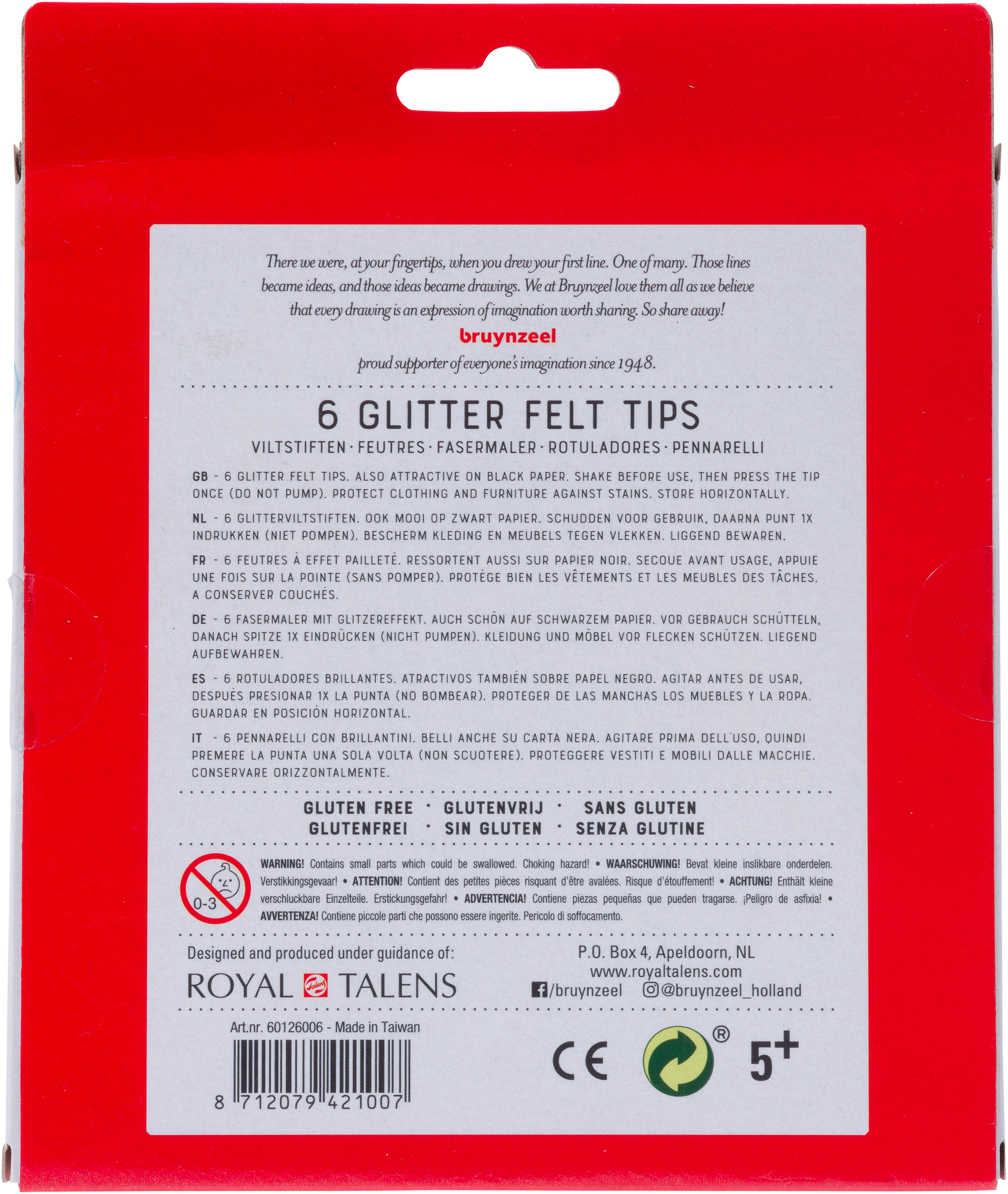 Mit diesen Fasermalern von Bruynzeel lassen sich wunderschöne Glitzereffekte kreieren! Einfach vor dem Gebrauch schütteln, die Spitze einmal auftippen und schon kann man seiner Kreativität freien Lauf lassen! Die Packung enthält 6 Stifte in brillanten Farben. Geeignet für Kinder ab 5 Jahren. Eigenschaften: gute Farbabgabe, ideal für wunderschöne Effekte auf weissem und schwarzem Papier.