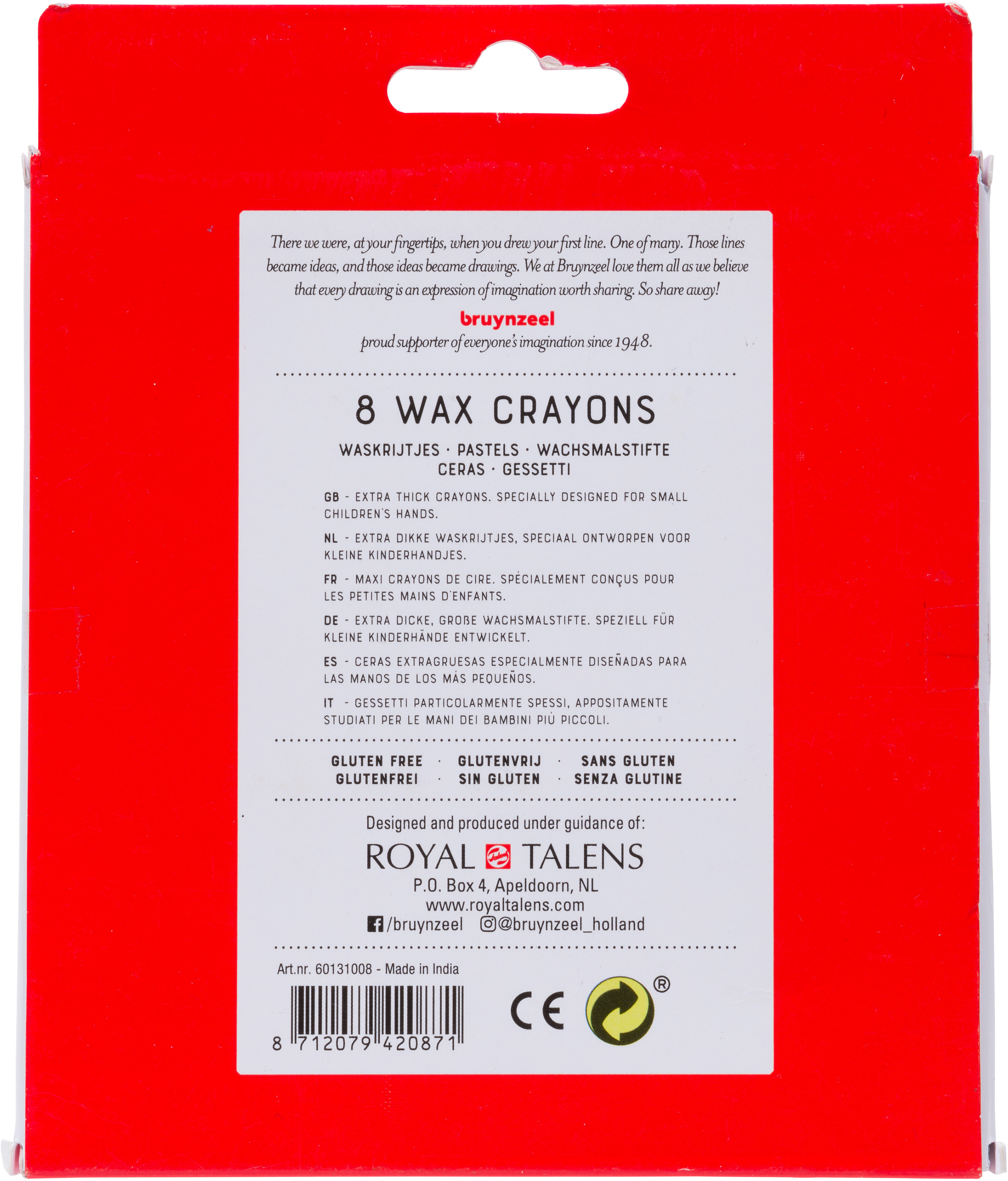 Die extra dicken Wachsmalstifte von Bruynzeel wurden speziell für kleine Kinderhände entwickelt. Die Wachsmalstifte sind weich und können mit Wasser gemischt werden, um noch mehr Kunstwerke zu kreieren! Sollten die Kleinen versehentlich einmal die Kleidung mit anmalen, ist das kein Problem, denn die Farbe lässt sich ganz einfach auswaschen! Die Packung enthält 8 Wachsmalstifte in den beliebtesten Farben. Geeignet für Kinder ab 2 Jahren. Eigenschaften: gute Farbabgabe, mit intensive Farben, ideal zur Förderung von Feinmotorik und Kreativität, auswaschbar aus den meisten Textilien, glutenfrei.
