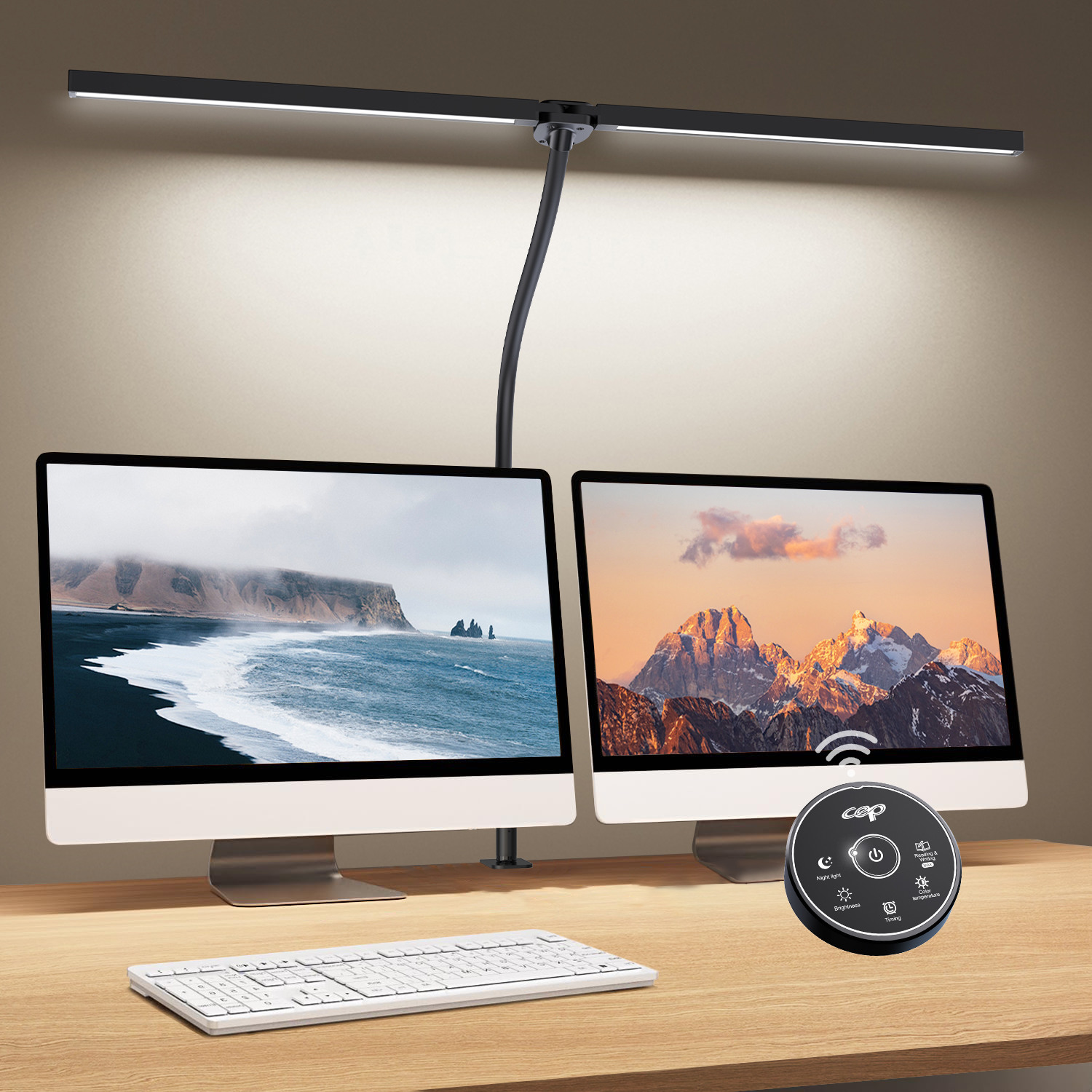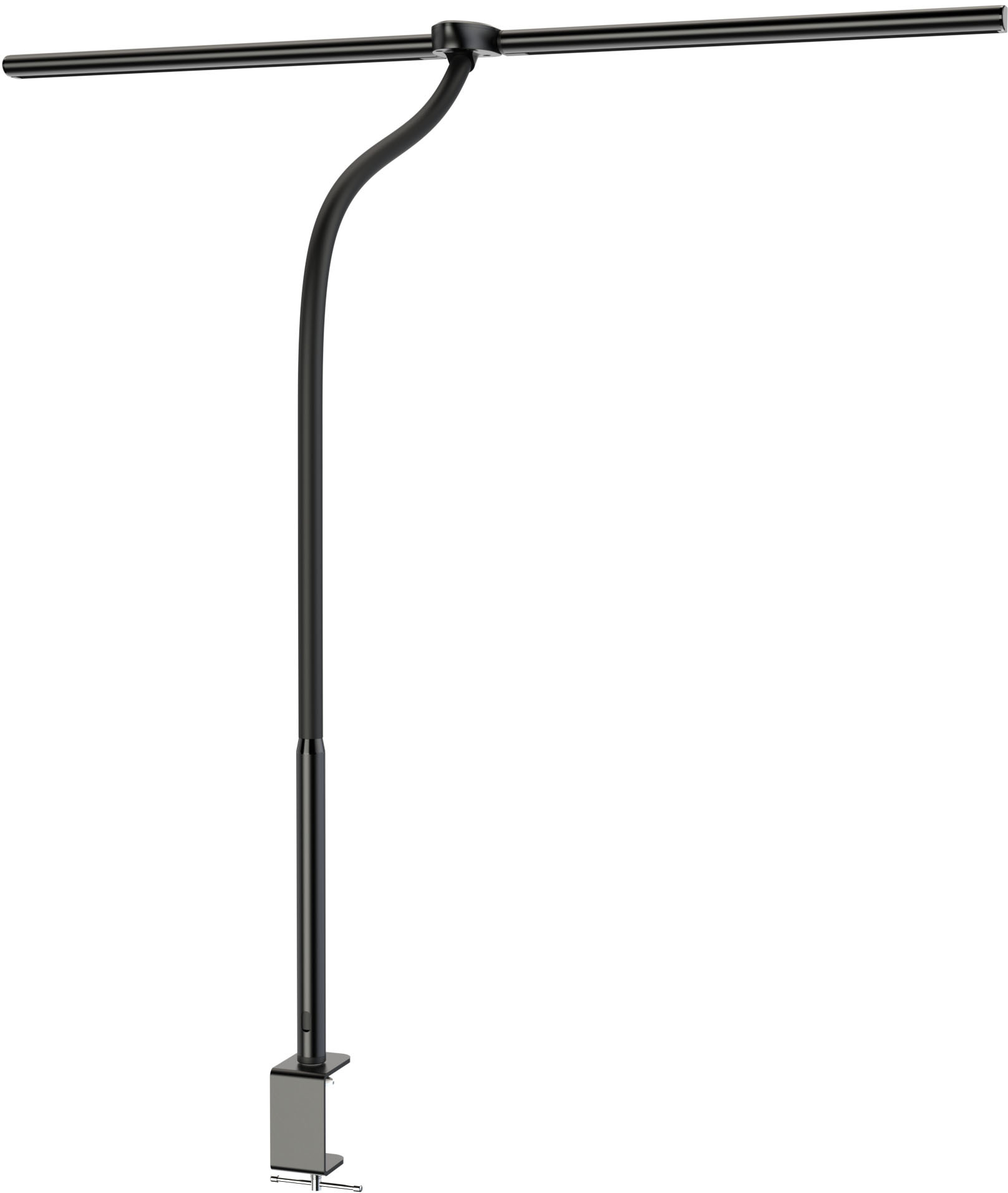 Tischleuchte mit innovativem Design: 2 LED-Lampenköpfe Die beiden LED-Köpfe sind beweglich (sie können zu einem einzigen LED-Modul zusammengefügt werden). Arm ist schwenkbar. Das Licht kann frei auf den gewünschten Winkel eingestellt werden. Die 2 Köpfe bieten eine sehr große Leuchtfläche. Praktisch bei Nutzung von zwei Bildschirmen. Asymmetrische blendfreie Beleuchtung. Klemmfuß mit Schraubzwinge, der eine sichere Anbringung am Bürotisch ermöglicht. Platzsparend. Leistung: 20W /24V-1A. Aus ABS Material+Stahl. Farbtemperatur 3000K/5700k-5500K. Lumen 1100lm. LED typ SMD/2835.CRI >95. Fernbedienung + Berührungsschalter: Sie können die Leuchte mit der Fernbedienung ein- und ausschalten, sowie Helligkeit und Farbtemperatur einstellen. Abmessungen: H 67cm, Länge (pro Kopf): 80 cm Farbe: Schwarz