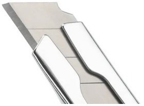 Profi Cuttermesser mit Metallgehäuse und 9 mm Klinge. Formschöne Cutter für saubere Schnittflächen und glatte Kanten. Das vielseitige Werkzeug für den Profi. Die Standard-Abbrechklinge, aus rostfreiem Stahl, kann mittels Rasterautomatik vorgeschoben werden. Die Metallführung der Schneidklinge sorgt für Sicherheit im Handling und garantiert einen exakten Schnitt. Eine Abbrechhilfe ist im Verschlussteil der hinteren Messerzuführung integriert. Ergonomisch geformter Griff aus Metall mit Rippenstruktur für sicheren Halt. Lieferung mit eingesetzter Klinge auf SB-Karte