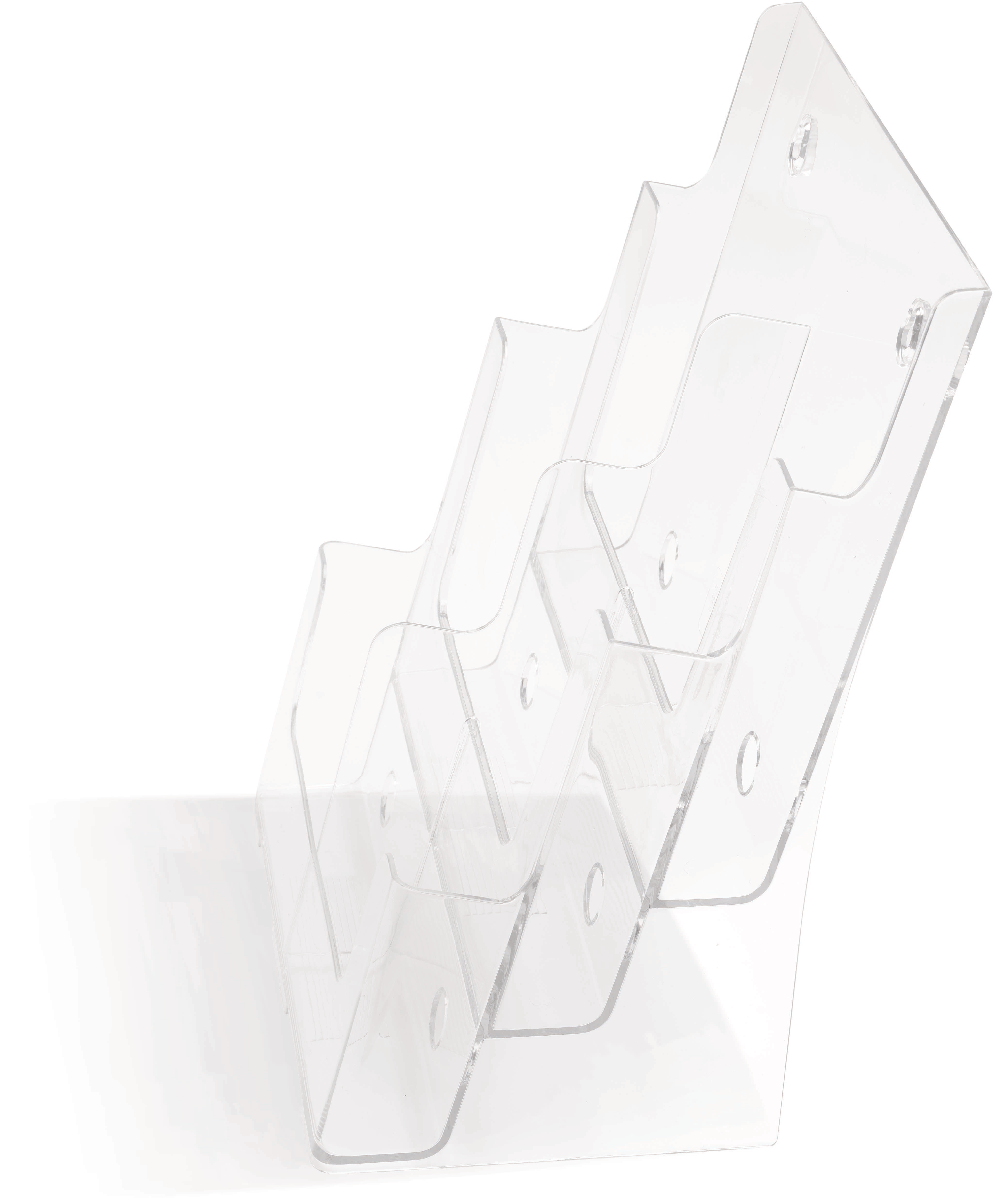 Mehrstufiger Prospekthalter für eine Vielzahl von Prospekten, spart wertvolle Standfläche. Abgeschrägt, für eine stabile Präsentation. So haben Sie Prospekte und Kataloge glasklar im Blickfeld. Wandmontage ebenfalls möglich. Material: Polystyrol. Grösse: DIN lang Hochformat, 2 x 3 Stufen, 245 x 322 x 195 mm (B x H x T).