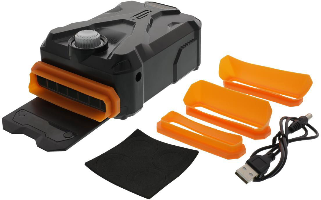 Laptop-Kühler, der an den Luftauslass deines Gaming-Laptops angeschlossen wird. Er wird über ein USB-Stromkabel mit Strom versorgt. Auf der Oberseite befindet sich ein silberner Knopf, der den Luftstrom des Kühlers steuert. Dieser Kühler funktioniert an den meisten Laptops, unabhängig davon, ob sich der Luftauslass Ihres Laptops auf der linken/rechten Seite oder auf der Rückseite befindet. Er wird jedoch nicht für Laptops empfohlen, die dünner als 10 mm sind.