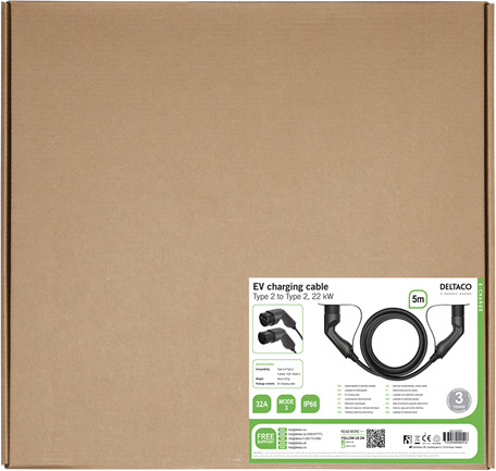 Das Deltaco e-Charge EV-3205 Ladekabel passt für alle Fahrzeuge mit einer Typ2-Steckdose für diejenigen, die über ein öffentliches Ladegerät oder ihre eigene spezielle Ladebox zu Hause mit Typ2-Steckdose laden wollen, sogenanntes Mode-3-Laden. Ladeleistung bis zu 22KW. Versilberte Anschlüsse garantieren einen guten Kontakt und eine lange Lebensdauer. Länge 5m. Ausgestattet mit Staubschutzhülle zum Schutz vor Staub, Schmutz und Feuchtigkeit während der Lagerung. Das Kabel ist aus einem TPE-Material gefertigt, das eine gute Beständigkeit gegen Öl, Abrieb und UV-Licht bietet. Das Kabel ist auch bei Kälte flexibel. Typ2-Steckdosen sind jetzt EU-Standard, Autos von Herstellern wie AUDI, BMW, Hyundai, KIA, Mercedes, Porsche, Seat, Skoda, Tesla, Volkswagen, Volvo verwenden alle Typ2-Steckdosen. Der Ladevorgang wird durch eine Zwei-Wege-Kommunikation zwischen dem Auto und dem Ladegerät überwacht. Wenn das Kabel in das Fahrzeug eingesteckt wird, wird ein Selbsttest durchgeführt, der sicherstellt, dass das Kabel richtig angeschlossen und das Fahrzeug bereit ist, Strom zu empfangen, bevor der Ladevorgang beginnt und das Kabel mechanisch unter Spannung gesetzt wird. Entriegeln Sie nach dem Aufladen das Fahrzeug, so dass sich die mechanische Verriegelung öffnet, und ziehen Sie das Ladekabel zunächst an der Seite des Fahrzeugs heraus, damit es vom Ladegerät getrennt wird. Das Kabel darf nicht repariert oder gespleisst werden, da dies seine Sicherheit und Funktion beeinträchtigen kann.