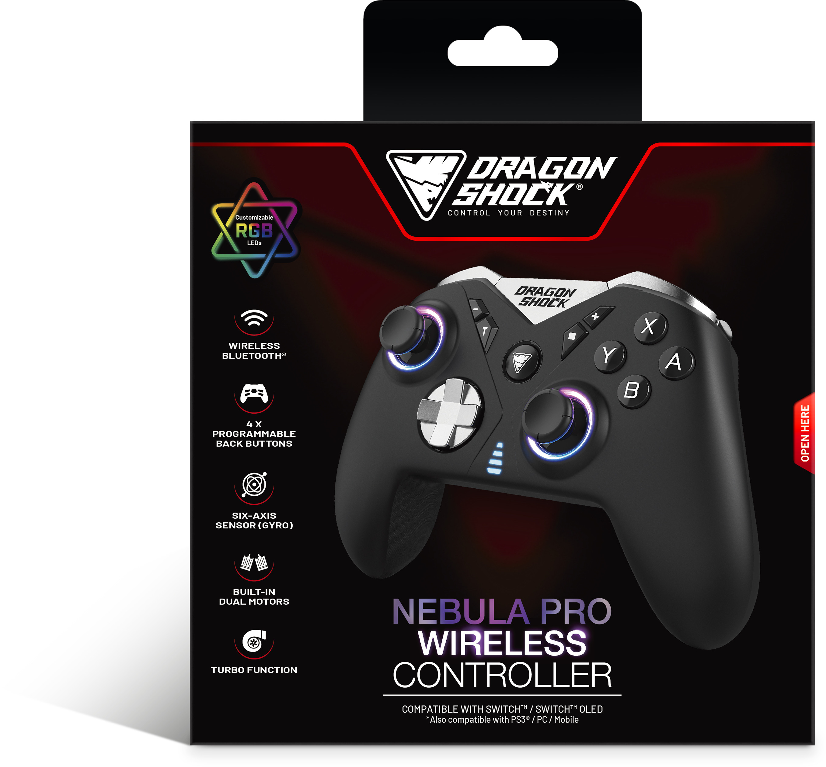 Der Dragonshock NEBULA PRO BT Wireless Controller ist Ihr ultimativer Gaming-Begleiter. Dieser funktionsreiche Controller wurde entwickelt, um Ihr Spielerlebnis auf einer Vielzahl von Plattformen zu verbessern und sicherzustellen, dass Sie immer bereit für Action sind, egal wo Sie spielen. Multiplattform-Meisterschaft - Kompatibel mit Nintendo Switch™ und der neuen Switch™ OLED. Ausserdem kompatibel mit PS3®, PC und mobilen Geräten mit Android. Kabellose Freiheit - Erleben Sie die Freiheit des kabellosen Spielens mit Bluetooth®-Konnektivität. Individuelle Beleuchtung - Gestalten Sie Ihren Controller mit leuchtenden RGB-Lichtern, die zu Ihrem Stil passen. Immersives Feedback - Spüren Sie jeden Moment mit den eingebauten Dual-Motoren, die Ihrem Spielerlebnis Tiefe verleihen. Verbesserte Steuerung - Geniessen Sie die Flexibilität von 4 programmierbaren Rücktasten für schnelle und präzise Aktionen. Verschaffen Sie sich einen Vorteil mit der Turbo-Funktion für schnelles und nahtloses Gameplay. Komfort trifft Präzision - Die Soft-Touch-Gummi-Oberfläche sorgt für einen angenehmen Griff, auch bei langen Gaming-Sessions. Präzision an Ihren Fingerspitzen: Navigieren Sie mit dem Sechs-Achsen-Sensor (Gyro) präzise durch die Spielwelt, um jede Ihrer Bewegungen zu erfassen. Langanhaltende Leistung - Mit dem 550-mAh-Akku können Sie lange Spielesessions ohne Unterbrechung geniessen. Einfaches Aufladen - Das Aufladen ist mit dem mitgelieferten 2-Meter-Typ-C-Kabel ein Kinderspiel, damit du immer spielbereit bist. Mit einem Controller, der Komfort, Anpassbarkeit und Leistung vereint, erreicht dein Gaming neue Dimensionen. Mach dich bereit, mit dem Dragonshock NEBULA PRO neue Gaming-Horizonte zu erobern.
