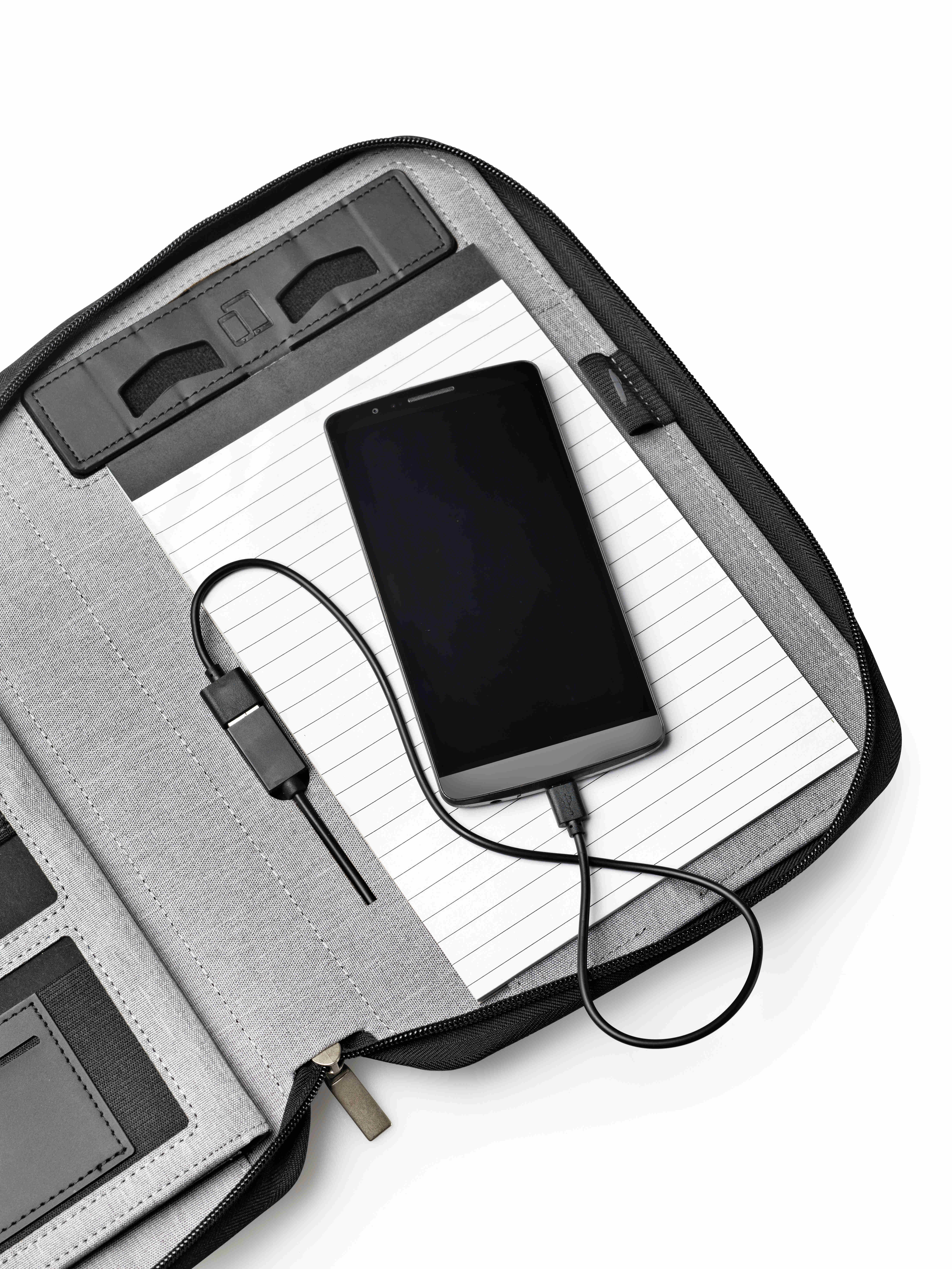 - Auf der Vorderseite zusätzliche Einschubtasche für Unterlagen oder Smartphone