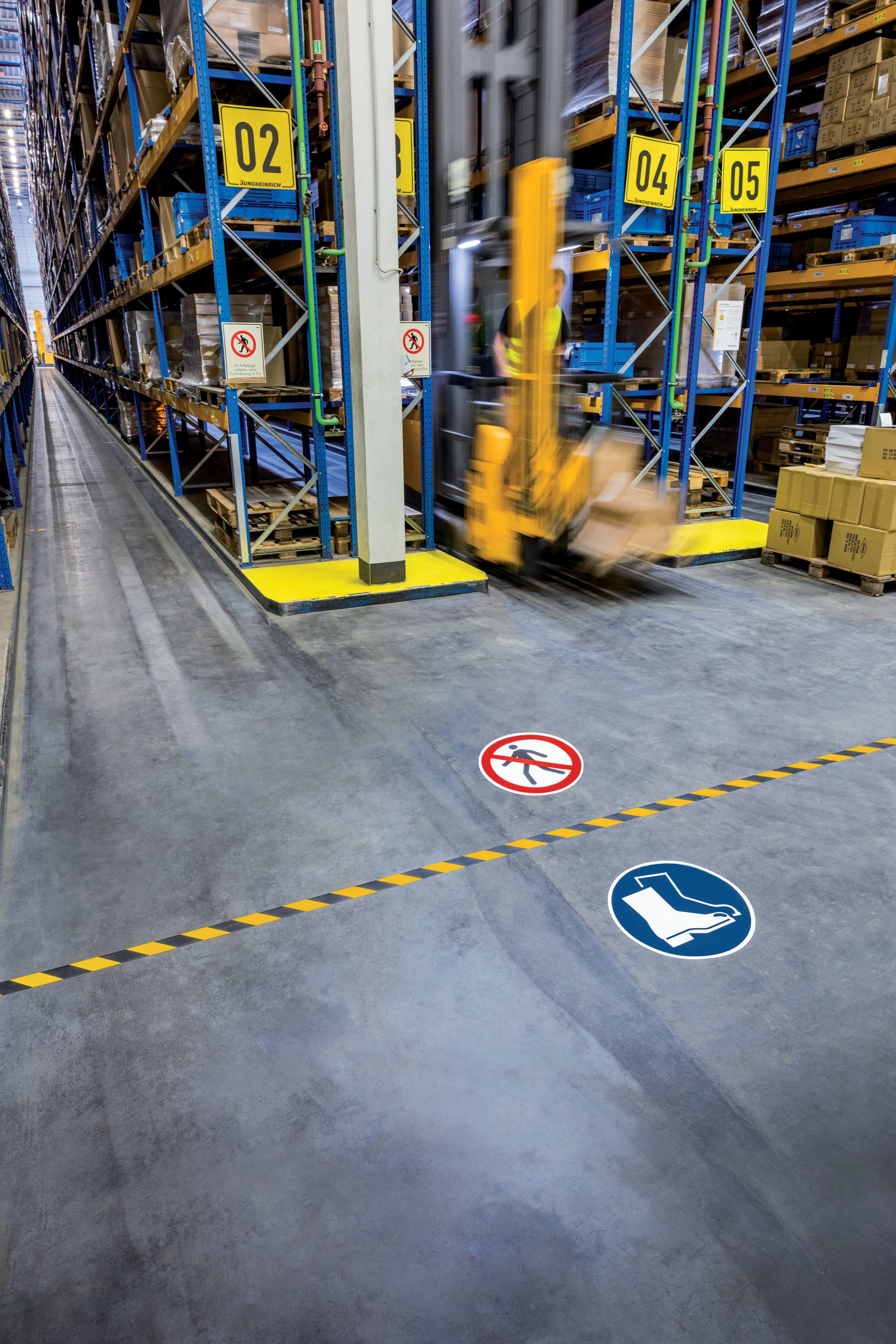 Selbstklebendes, zweifarbiges Bodenmarkierungsband für den Innenbereich, ideal für eine robuste und langfristige Kennzeichnung von Geh- und Fahrwegen in Lager und Betrieb.
