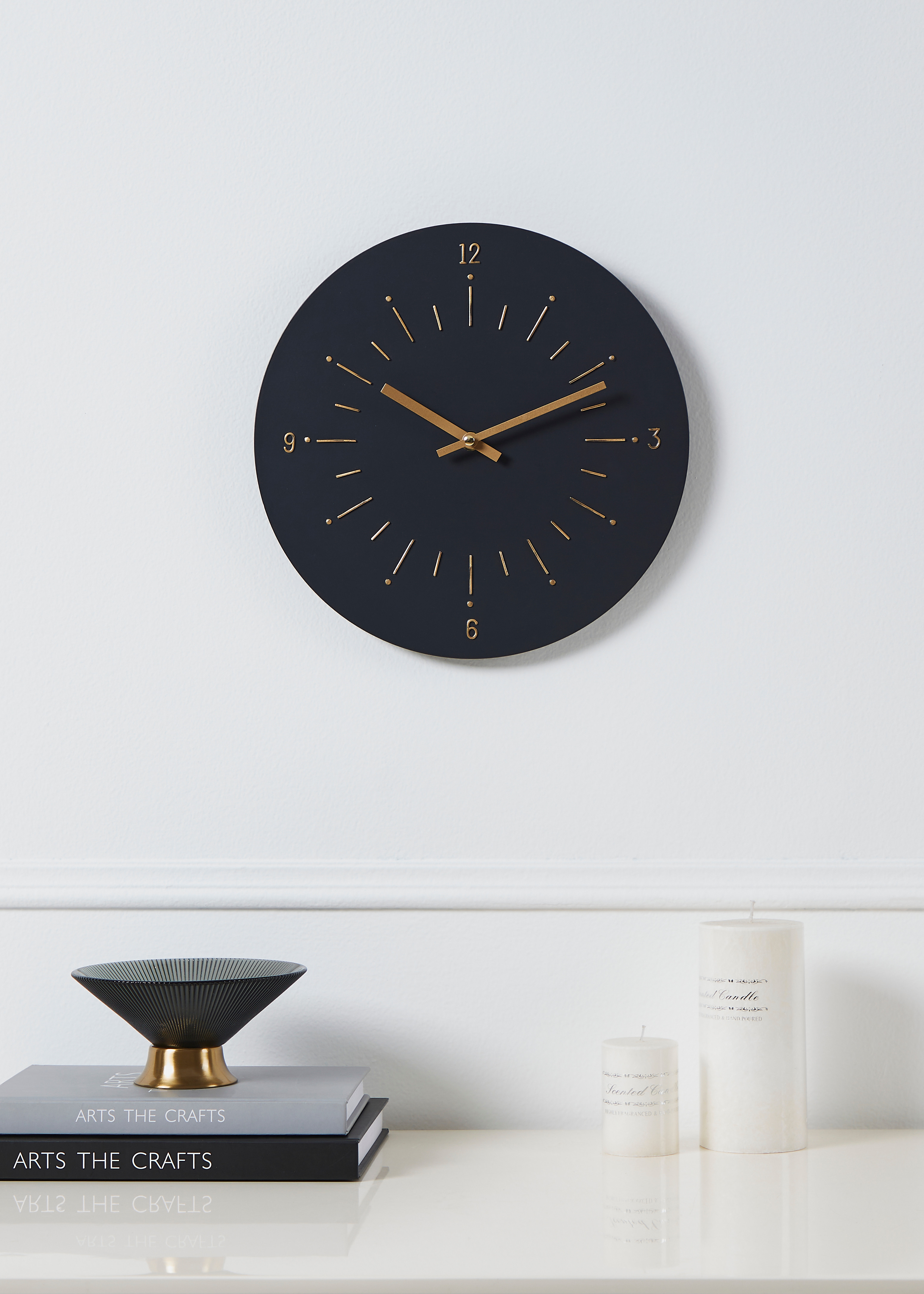 Behalte mit der stilsicheren TAKAHAGI Wanduhr immer die Zeit im Blick. Mit ihrem schlichten Industrial-Style schmückt dieses Deko-Accessoire deine Wand im Wohn-Essbereich, Schlafzimmer oder Office. Die Uhr in mattem Schwarz fügt sich mit ihren Zeigern in Messingfarben bestens in jede Einrichtung ein. <br>Die Wanduhr wird exklusive Batterien geliefert. Mit dem Einstellrad auf der Rückseite kannst du bequem die Zeit einstellen. Das Bewegen der Zeiger von Hand kann das Uhrwerk beschädigen.<br>Die Deko-Uhr hat einen Durchmesser von 30 cm.
