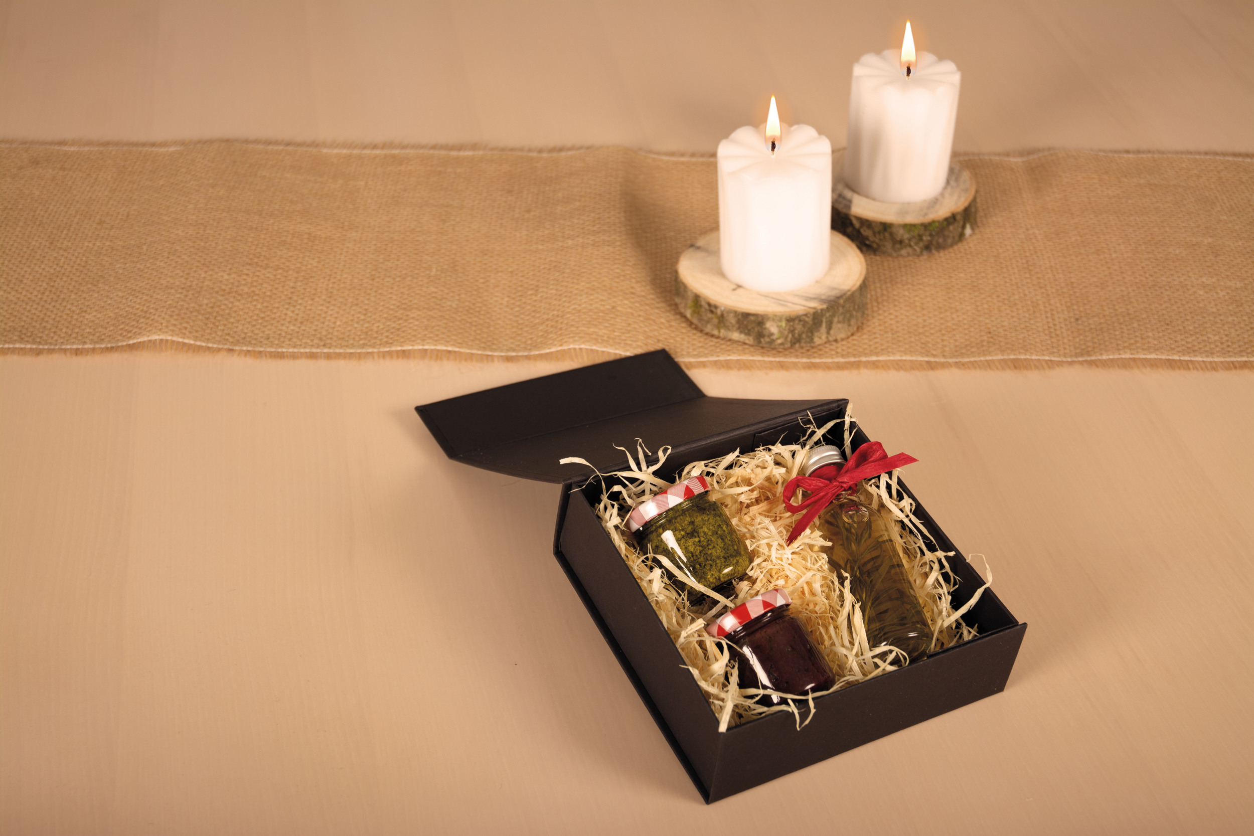 Hochwertige Geschenkbox aus schwarzem Karton (1200 g/m²). Mit Magnetverschluss. Flach angeliefert und dank Haftklebestreifen einfach aufzustellen.