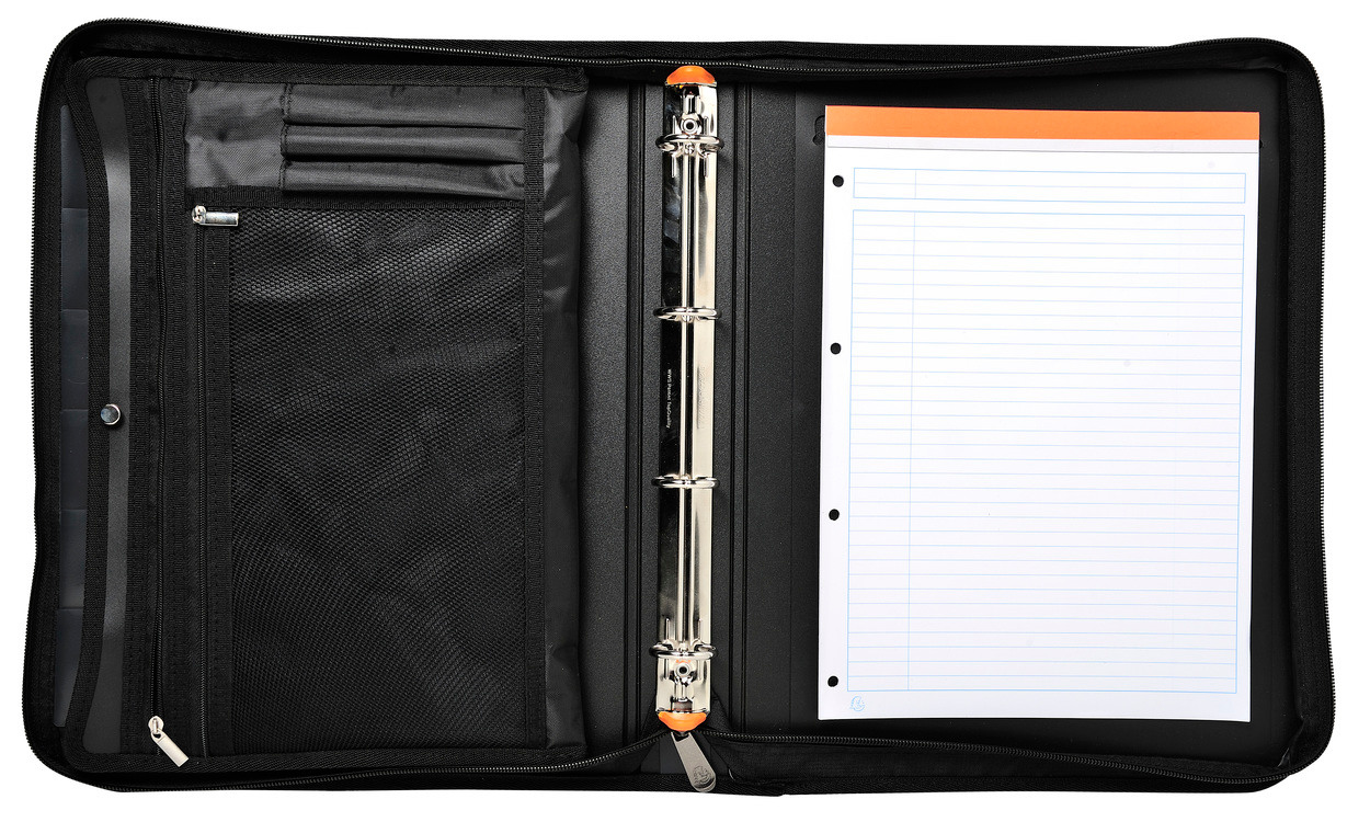Neues Material : Aus 80% recycletem Polypropylen, ökologisch, leicht und robust. Konferenzmappe mit Reissverschluss und einschiebbaren Griffen. Mit Innenfächern mit und ohne Reissverschluss, Fächer für Visiten- und Kreditkarten. Leicht, mobil und funktionell : ideal zum Transport von gelochten und ungelochten Dokumenten, mit liniertem Schreibblock DIN A4.