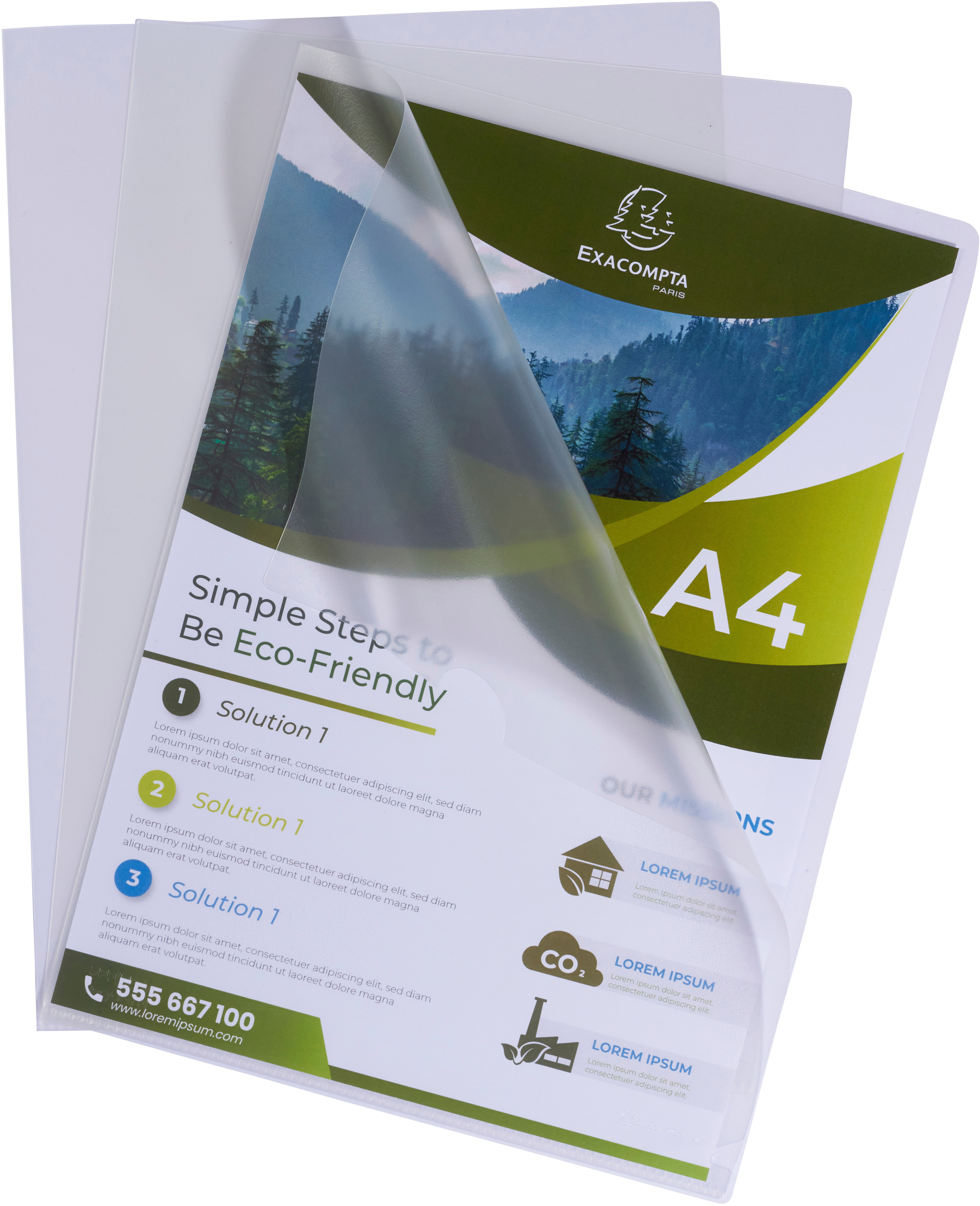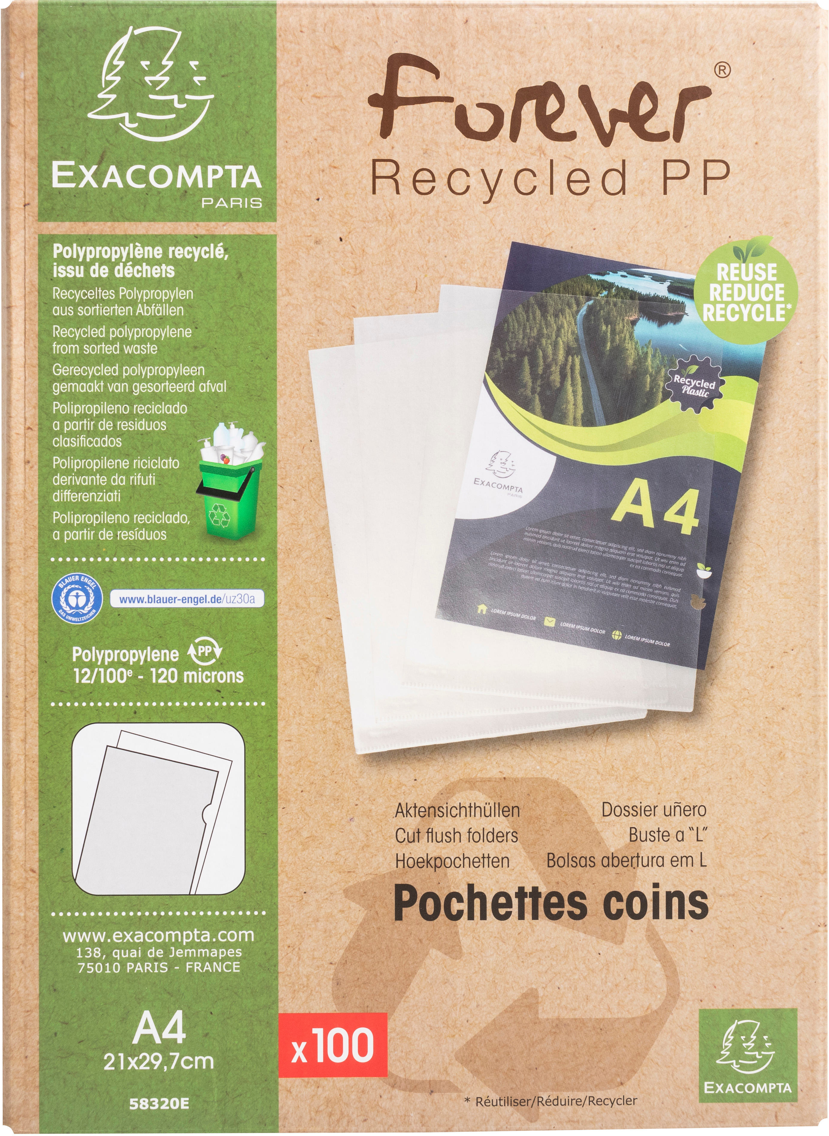 100 Klarsichthüllen, Recycling-PP 120µ, Forever Exacompta setzt sich dafür ein, die ökologischen Auswirkungen seiner Produkte zu reduzieren, vor allem bei seinen Klarsichthüllen aus Kunststoff. Die Hüllen werden vollständig aus recyceltem Polypropylen hergestellt, das aus Post-Consumer-Abfällen stammt, die gesammelt, sortiert und wiederverwendet wurden. Dies ist eine echte Revolution auf dem Markt für Schutz- und Präsentationshüllen, auf dem Kunststoff immer noch unverzichtbar ist. Genarbte Hüllen mit einer Standardstärke von 120. Flexible, transparente Hüllen für den täglichen Gebrauch. Reissfest und tintenabwe isend, damit Sie Ihre Dokumente lange aufbewahren können. L-förmige Öffnung oben und auf der rechten Seite, mit Aussparung, um das Einlegen von Dokumenten zu erleichtern. Die Klarsichthüllen sind mit dem Blauen Engel ausgezeichnet, dem anspruchsvollsten Gütesiegel für Recyclingprodukte, das die Verwendung von recycelten Post-Consumer-Materialien garantiert.