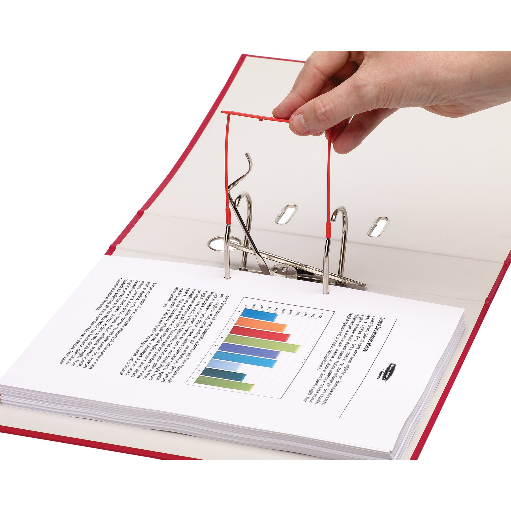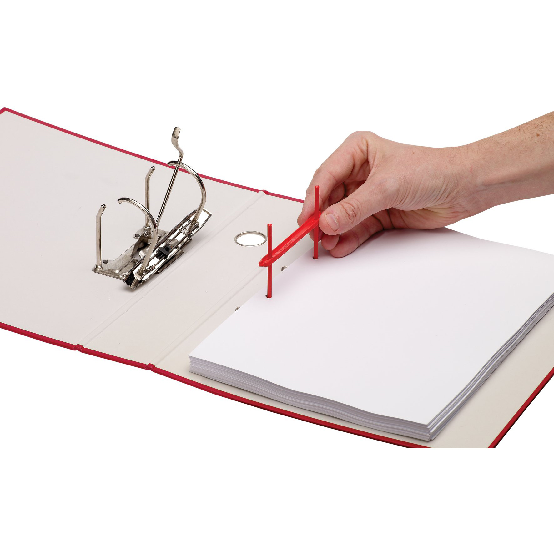Zweiteiliger Plastikclip mit verlängerten Aufreihstiften, inklusive Bügel zur einfachen Entnahme der Dokumente aus Ordnern.
