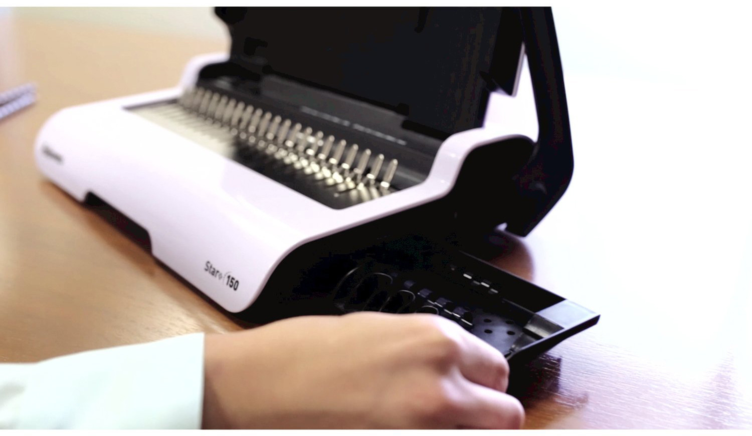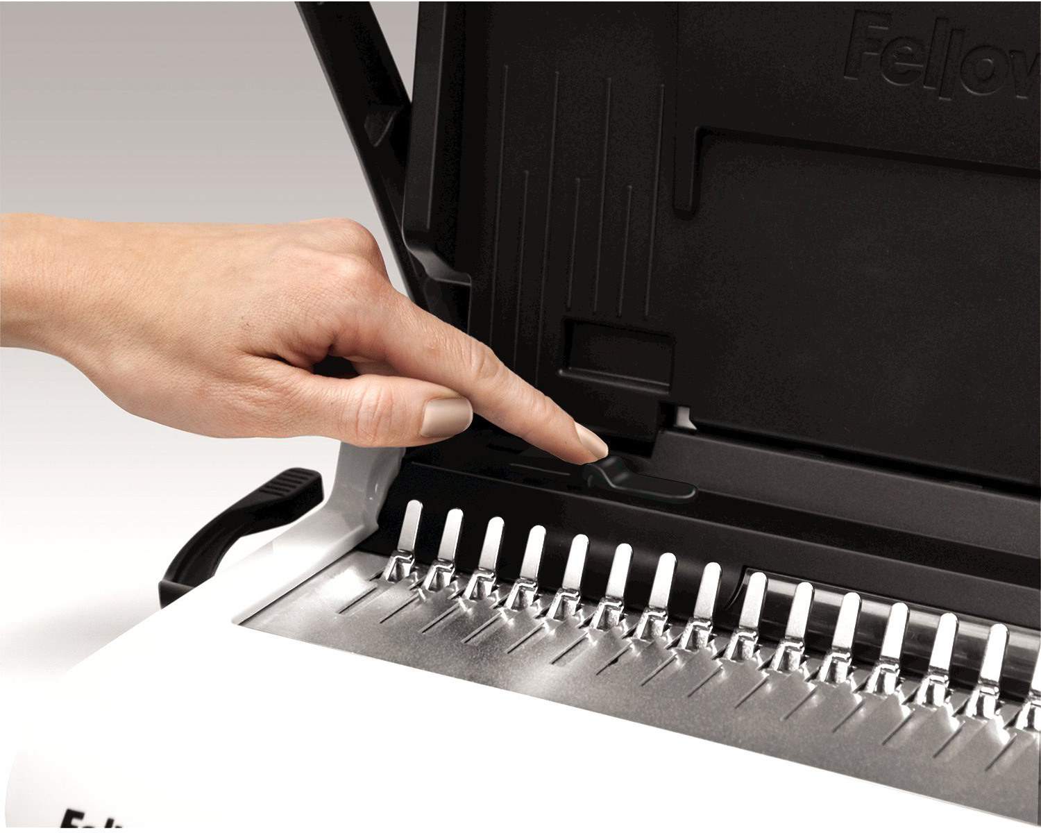 Stanzkapazität 15 Blatt (80g/m² Papier), Bindekapazität 150 Blatt mit max. 19mm Plastikbinderücken, müheloses manuelles Stanzen dank durchgängigem Stanzhebel, angewinkelter Kammträger erleichtert das Einlegen der Blätter, einstellbarer Schieber-Randanschlag zur genauen Ausrichtung des Papiers, Aufbewahrungsfach mit patentierter Dokument- und Binderückenmessfunktion zur schnellen Auswahl des passenden Binderückens, Stanzrestefach öffnet sich automatisch wenn voll, Masse: 8 x 45 x 28 cm.