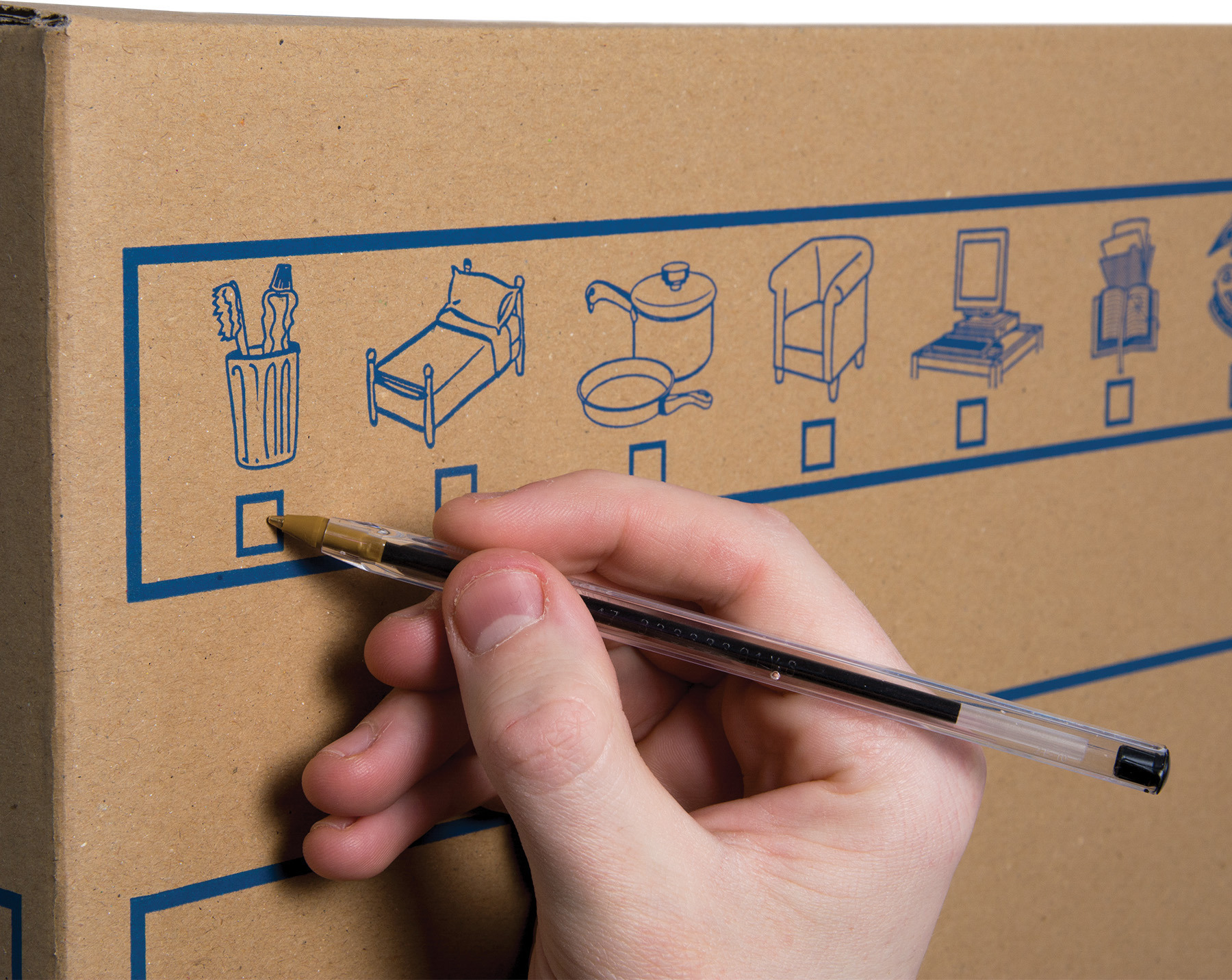 Stabiler Umzugskarton hergestellt aus doppelt verstärkter Wellpappe. Vorgedrucktes Beschriftungsfeld mit Symbolen zur leichten Identifikation des Inhalts. Perforierte Tragegriffe können bei Wunsch auf Verwendung eingedrückt werden. Hergestellt aus FSC® zertifiziertem Karton, 100% recycelbar.