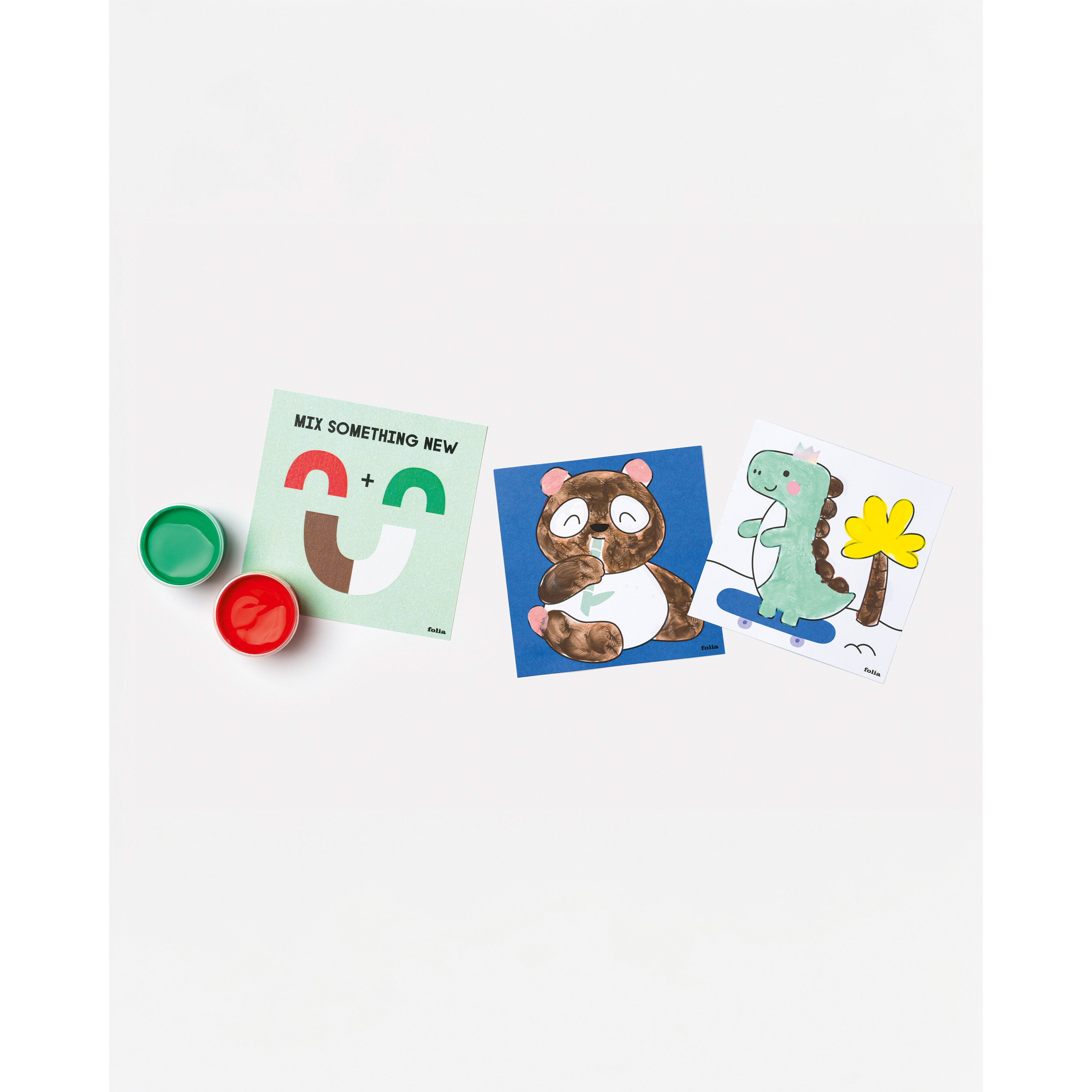 Händchen in Farbe eintunken erlaubt: Glitzernde Vorlagen für Safari- & Regenbogenfans wollen nach Lust und Laune mit Fingern bemalt werden. Dabei ist der Kreativität der kleinen Künstler*innen keine Grenze gesetzt: Mit Hilfe von Mischvorlagen lassen sich aus den 5 Farbtöpfchen fix neue Farben zaubern.