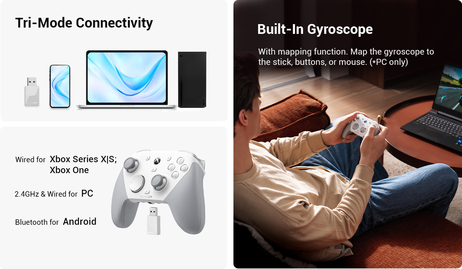 - Verbessern Sie Ihre PC-Steuerung mit dem integrierten Gyroskop. Sie können das Gyroskop Stick, Tasten oder Maus zuordnen. Das ermöglicht präziseres und intuitiveres Gameplay.