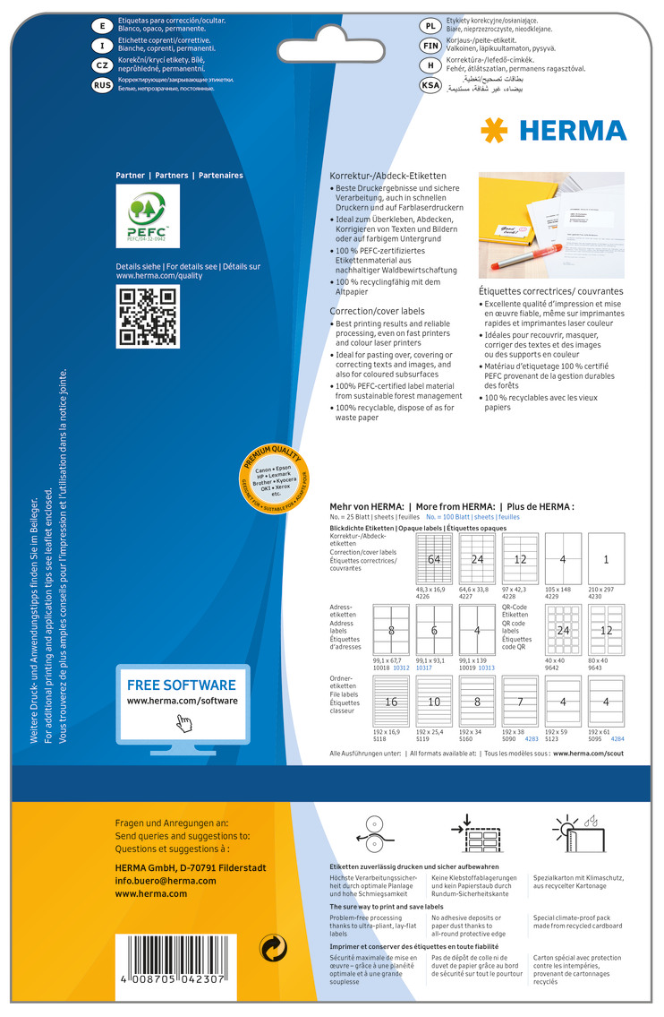 Blickdichte Korrektur/Abdecketiketten, auf A4-Blättern, selbstklebend. Ideal zum Überkleben, Abdecken und Korrigieren von unerwünschten oder fehlerhaften Texten und Bildern oder auf farbigem Untergrund. Absolut deckend - nichts scheint durch. Umweltfreundlich: hochwertiges, chlorfrei gebleichtes Spezialpapier, PEFC-zertifiziert, lösemittelfreier Haftkleber, 100 % recyclingfähig mit dem Altpapier. Sehr gute Druckergebnisse auf allen Laser- und Inkjetdruckern, Kopierern, Farblaserdruckern und Farbkopierern. Störungsfreie Verarbeitung durch Rundum-Sicherheitskante und optimale Planlage. Kostenlose Softwarelösungen: www.herma.de/software.