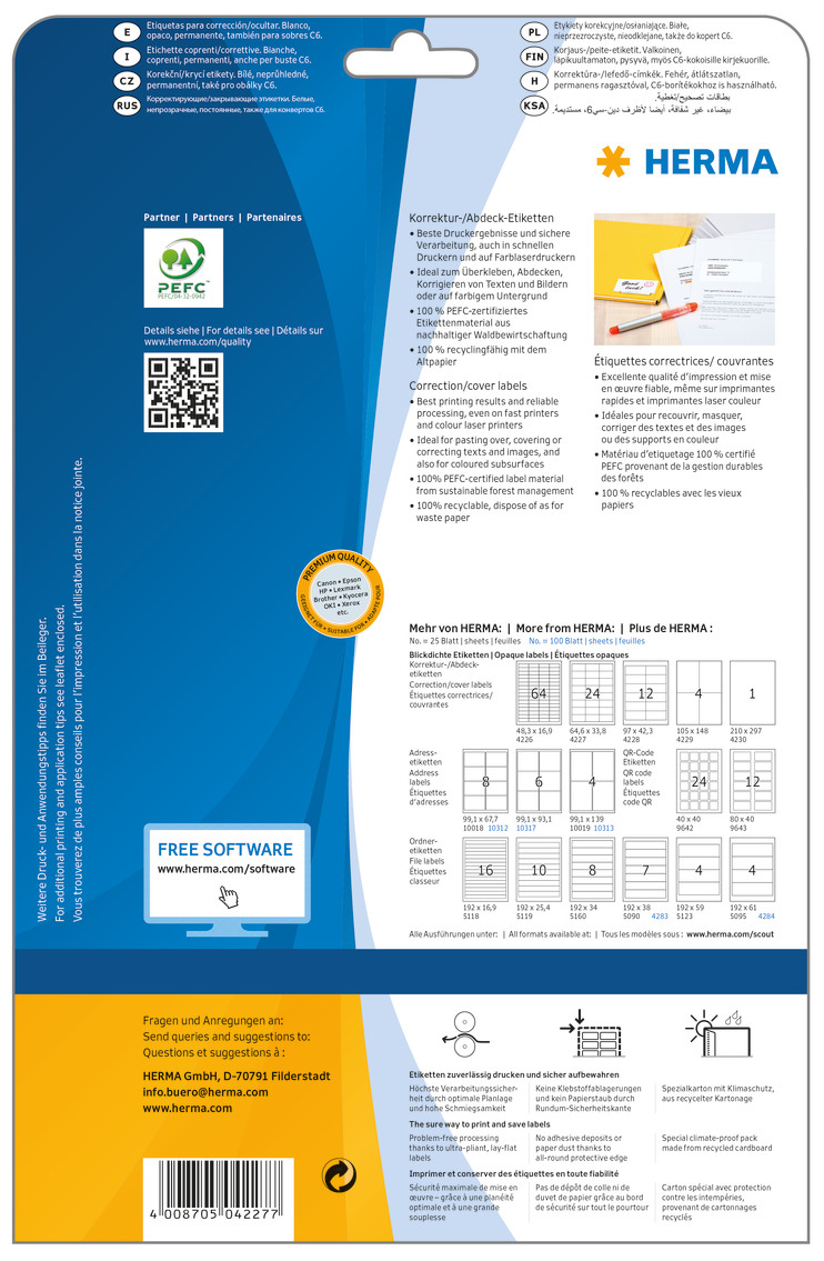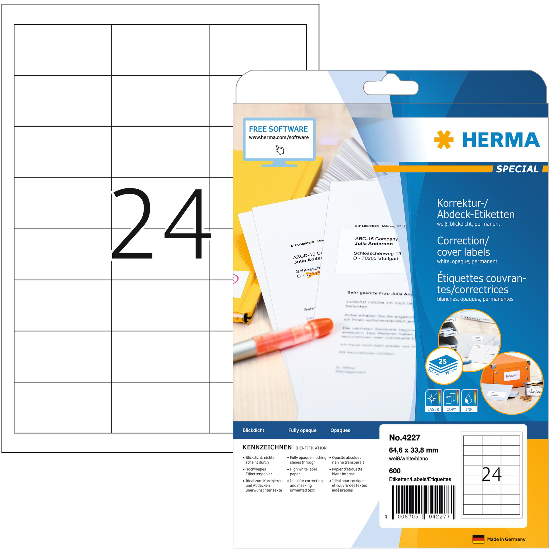 Blickdichte Korrektur/Abdecketiketten, auf A4-Blättern, selbstklebend. Ideal zum Überkleben, Abdecken und Korrigieren von unerwünschten oder fehlerhaften Texten und Bildern oder auf farbigem Untergrund. Absolut deckend - nichts scheint durch. Umweltfreundlich: hochwertiges, chlorfrei gebleichtes Spezialpapier, PEFC-zertifiziert, lösemittelfreier Haftkleber, 100 % recyclingfähig mit dem Altpapier. Sehr gute Druckergebnisse auf allen Laser- und Inkjetdruckern, Kopierern, Farblaserdruckern und Farbkopierern. Störungsfreie Verarbeitung durch Rundum-Sicherheitskante und optimale Planlage. Kostenlose Softwarelösungen: www.herma.de/software.