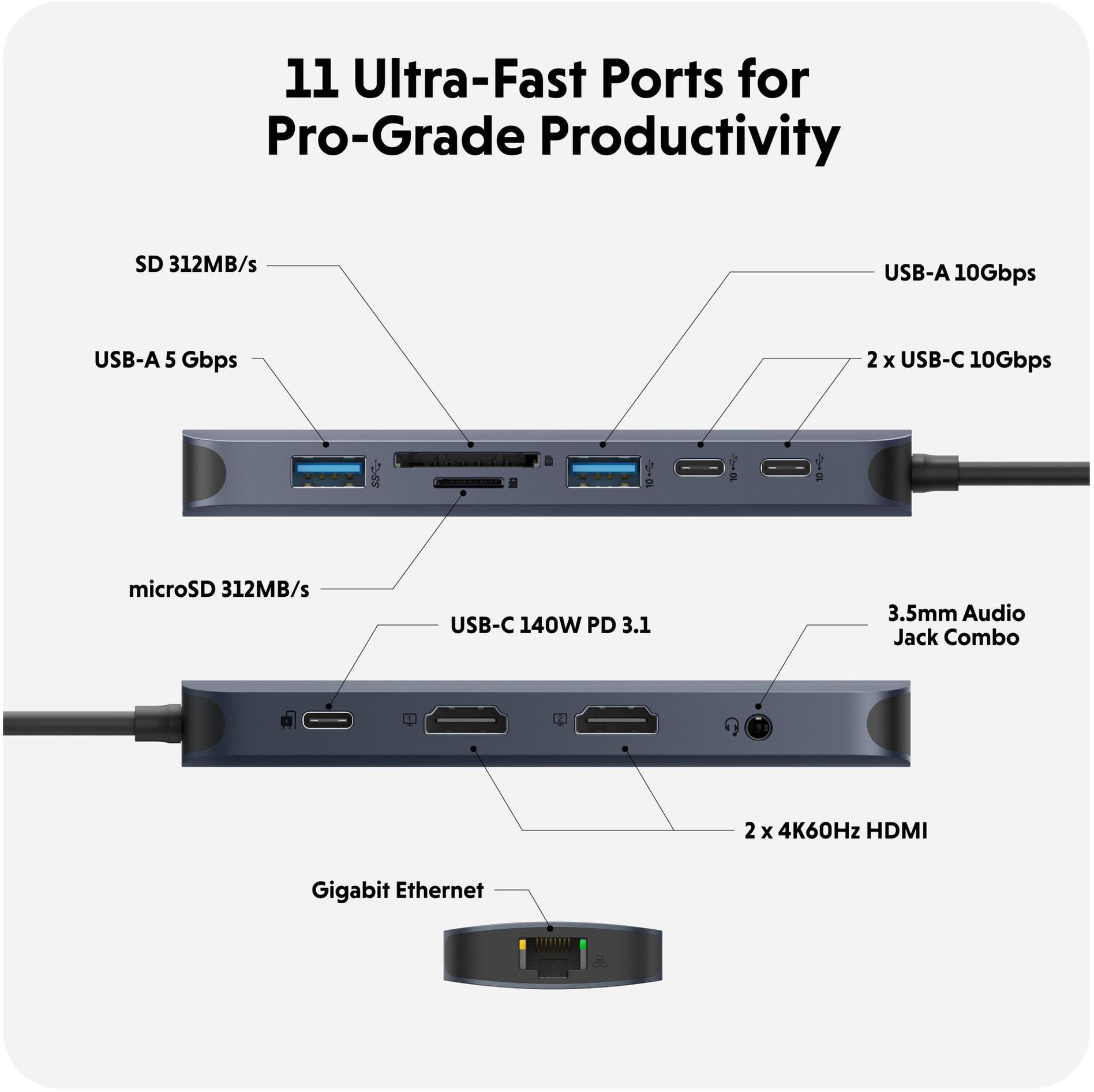Wir stellen den HyperDrive® Next 11 Port USB-C Hub vor - die ultimative Konnektivitätslösung für Kreative, Redakteure, Fotografen und mehr. Mit Unterstützung für zwei 4K 60 Hz Monitore* für PC und Chromebook™, 11 ultraschnellen Anschlüssen und blitzschnellen Datenübertragungen können Sie Ihr kreatives Potenzial überall entfesseln. Erleben Sie 2-mal schnellere Dateiübertragungen mit den 10-Gbit/s-USB-Anschlüssen und 3-mal schnellere Foto- und Videoübertragungen mit microSD und SD 4.0. Profitieren Sie von 40 % mehr Leistung mit PD 3.1 140 W Power Pass-Through, der effizientes Aufladen gewährleistet. Maximieren Sie Ihre Produktivität mit dem HyperDrive® Next 11 Port Dual 4K USB-C Hub.