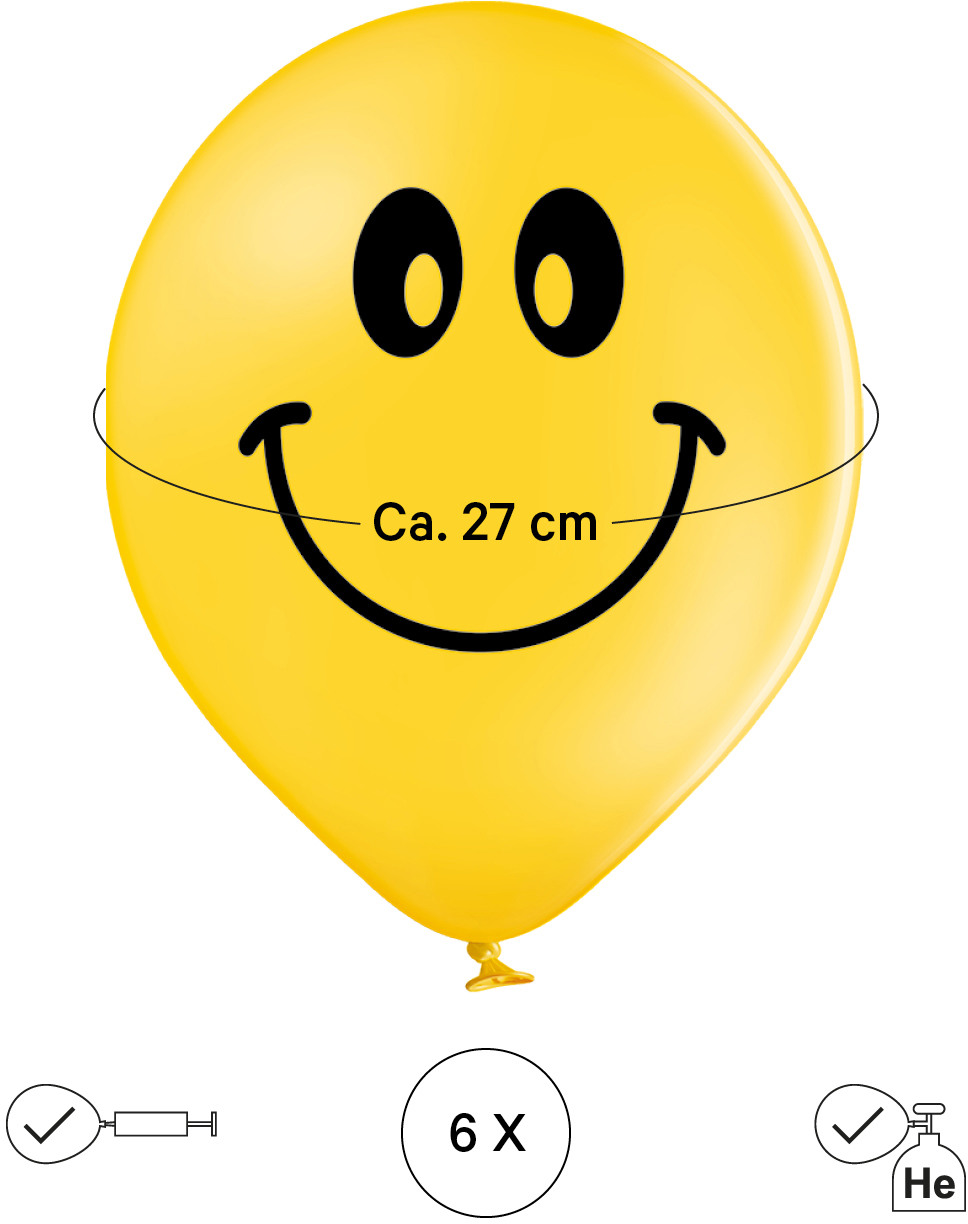 - Eigenschaften: Hochwertige Ballone mit Smiley Aufdruck, die deiner Feier eine fröhliche Note verleihen. Nach dem Aufblasen haben sie einen Durchmesser von etwa 27 cm.