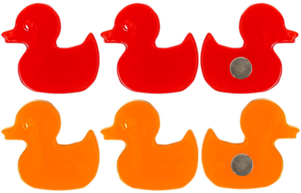 Die Dekomagnete in der 6er Packung eignen sich perfekt zum Anheften von Notizen in Küche, Schlafzimmer, Badezimmer, Garage oder am Kühlschrank. Die Magnete in Form einer Ente haben eine rote oder orangene Kunststoffhülle und erlauben das Umsetzen von vielen kreativen Ideen.