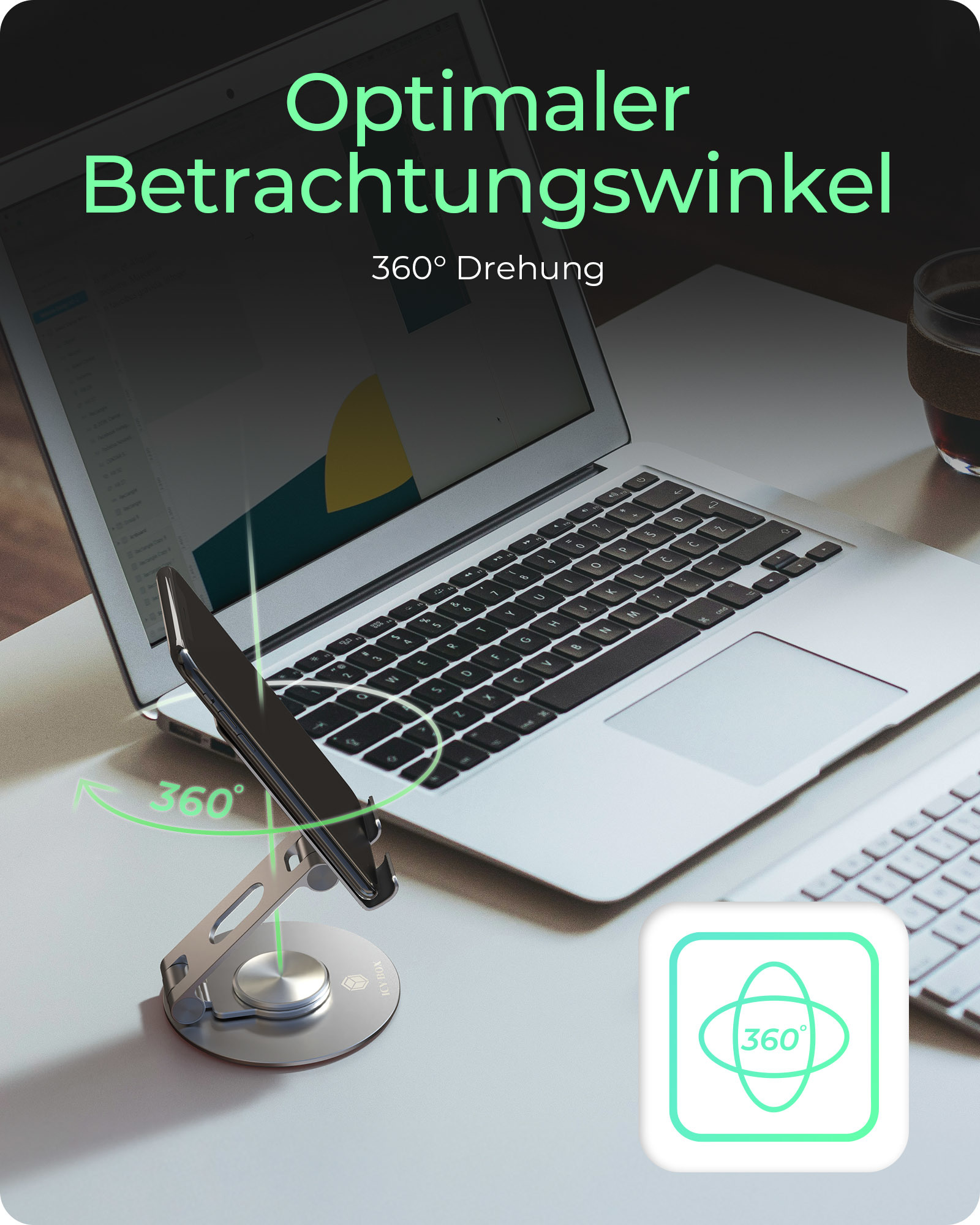 IB-TH201-R – Der elegante 360°-Ständer für Smartphone und Tablet bis 12,9 Zoll. Der IB-TH201-R ist mehr als nur ein Ständer – er ist ein vielseitiger Begleiter für alle, die ihr Smartphone oder Tablet komfortabel, stabil und stilvoll nutzen möchten. Mit seiner vollständig um 360° drehbaren Basis und dem flexibel verstellbaren Haltepanel bietet er eine ergonomische Lösung für jede Anwendung – ob beim Arbeiten, Streamen oder Videoanrufen. Gefertigt aus hochwertigem Aluminium, robustem Carbonstahl und rutschfestem Silikongummi vereint der IB-TH201-R Langlebigkeit mit eleganter Optik. Die stabile Konstruktion sorgt dafür, dass Ihr Gerät sicher steht, während die weichen Silikonauflagen zuverlässig vor Kratzern und Verrutschen schützen. Mit seinem kompakten, leichten Design ist der Ständer ideal für unterwegs – perfekt für das mobile Arbeiten oder entspanntes Medienkonsumieren im Urlaub oder im Café. Er ist kompatibel mit einer Vielzahl von Smartphones und Tablets bis zu 12,9 Zoll und passt sich flexibel Ihrem Alltag an. Ob zu Hause, im Büro oder unterwegs: Der IB-TH201-R bringt Komfort, Stabilität und Stil auf den Punkt.