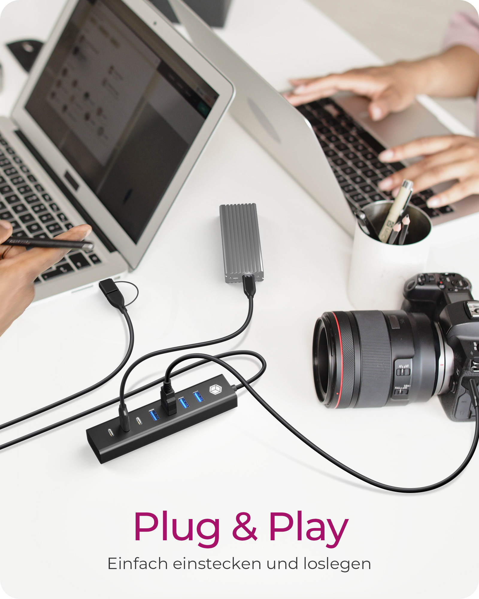 - Sehr schnell - Erzielen Sie Datenübertragungsgeschwindigkeiten von bis zu 5 Gbit/s mit USB 3.2 Gen 1, was das schnelle Übertragen großer Dateien erleichtert. Der Hub ist zudem rückwärtskompatibel, sodass ältere Geräte sicher verwendet werden können.