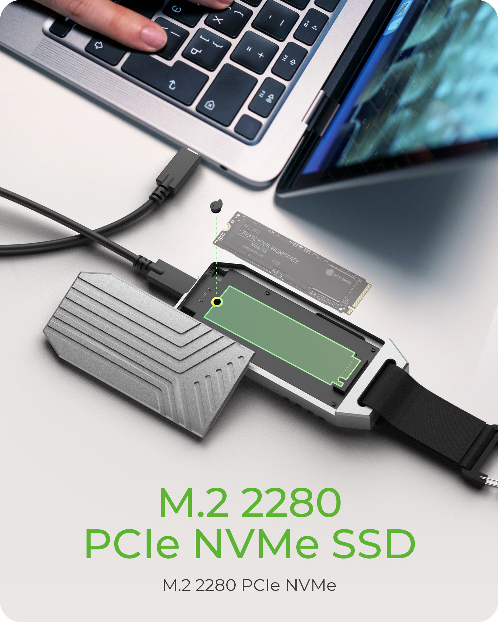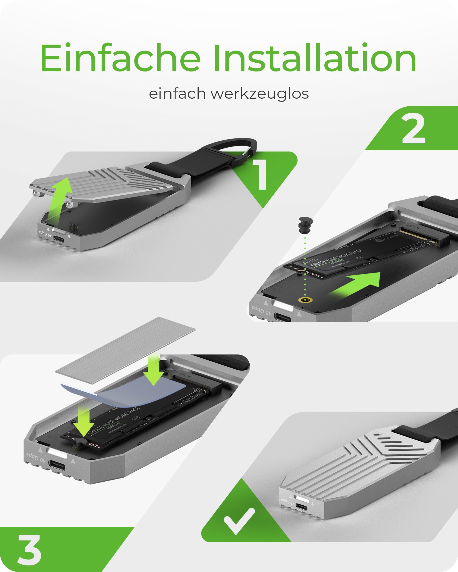 - Werkzeuglose Installation - Genießen Sie eine mühelose Einrichtung mit einem werkzeuglosen Design, das es Ihnen ermöglicht, Ihre M.2 NVMe SSD schnell und ohne Werkzeuge zu installieren. Schieben Sie einfach Ihre SSD hinein, sichern Sie sie und verbinden Sie sie—so einfach ist das!
