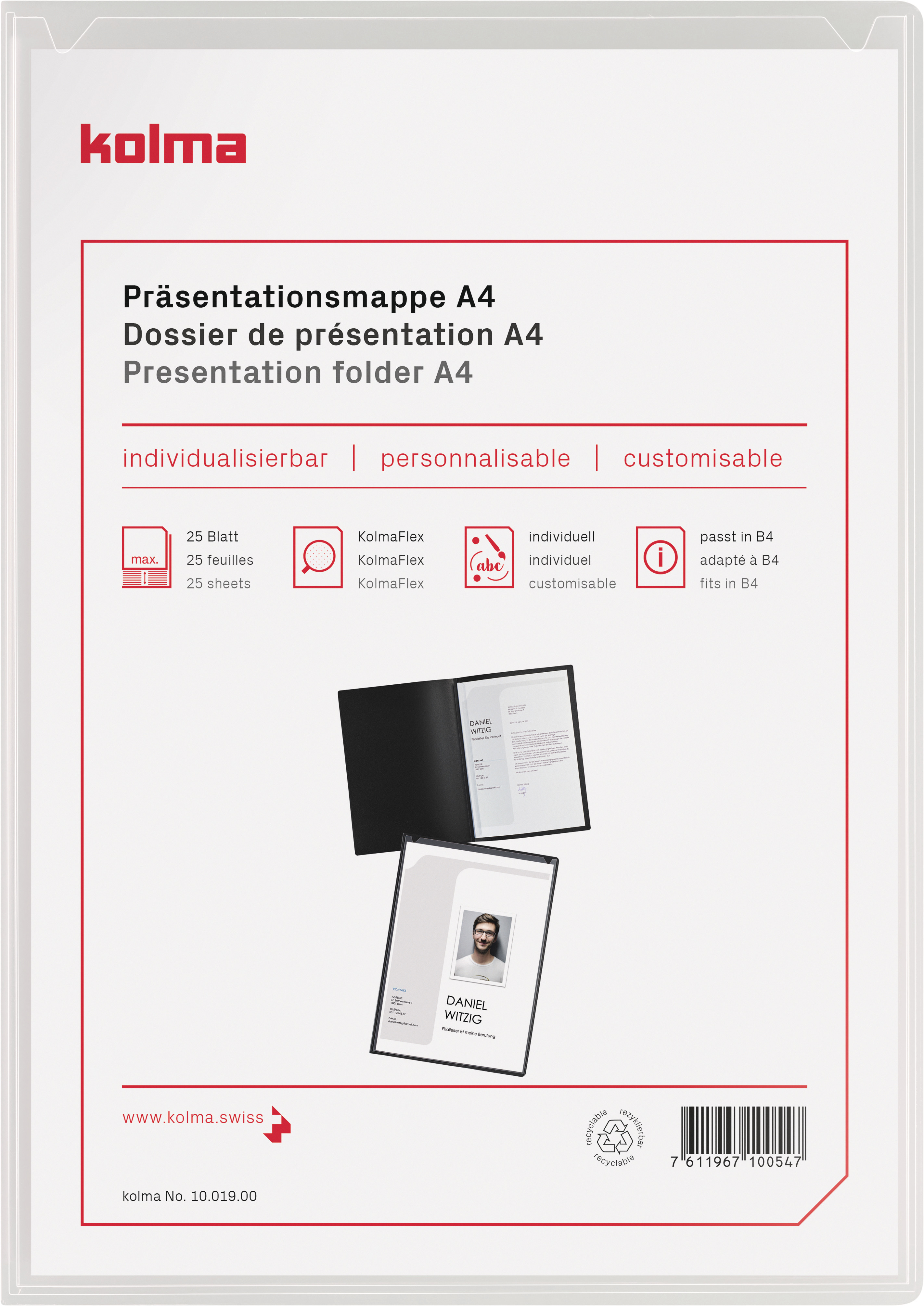 Die Bewerbungsmappe aus langlebigem KolmaFlex Material garantiert einen ansprechenden und bleibenden Eindruck. In der integrierten Klemmschiene können bis zu 25 Blatt (80 g/m2) sicher aufbewahrt werden. Dank der aufgeschweissten Tasche auf der Vorderseite, können Sie mit einem Titelblatt auf den ersten Blick überzeugen.