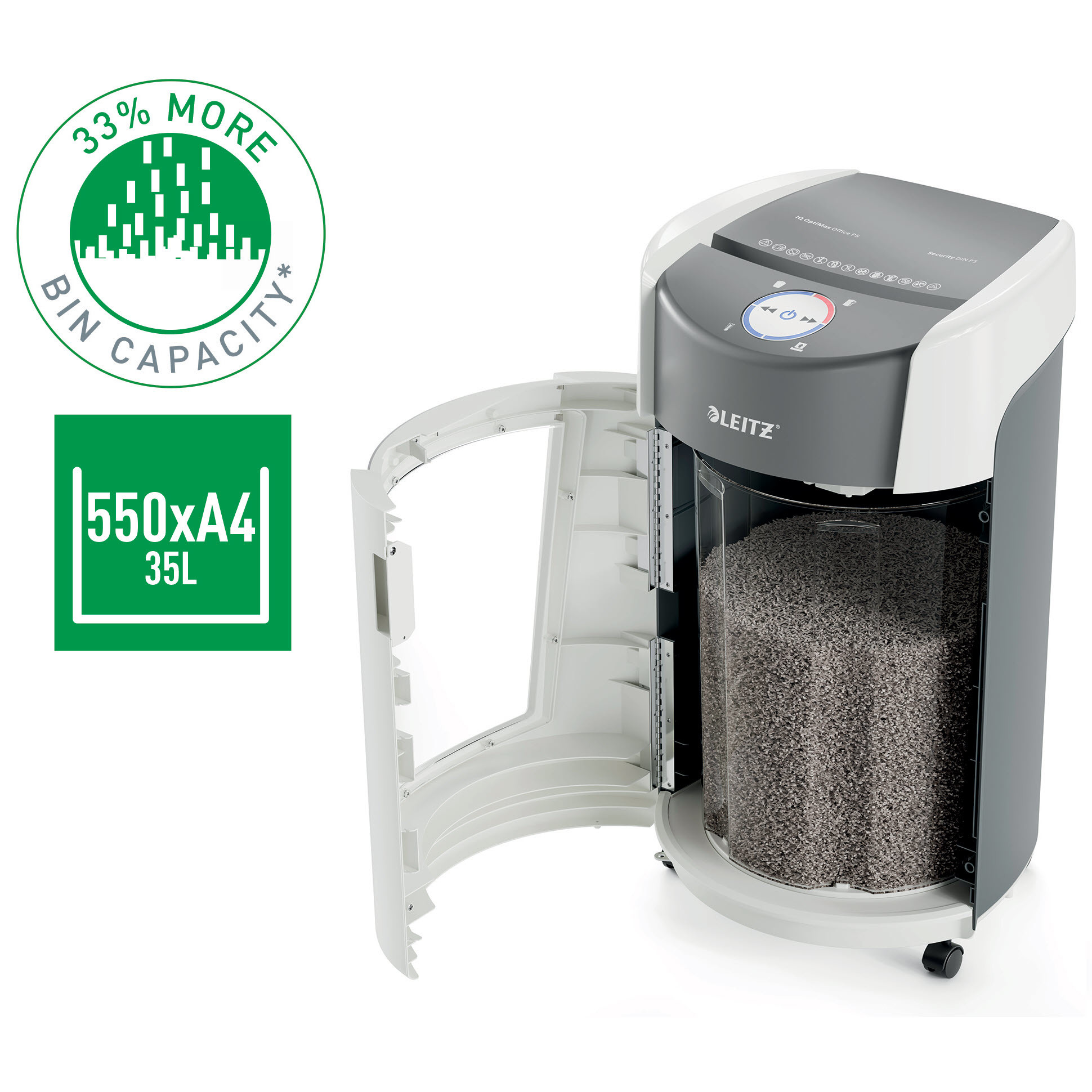 Der Leitz IQ OptiMax Aktenvernichter bietet eine innovative und elegante Lösung für die Aktenvernichtung und sorgt gleichzeitig für aussergewöhnliche Dokumentensicherheit und für ein gutes Gefühl. Dieser hochsichere DIN P5 Aktenvernichter zerkleinert mühelos bis zu 10 Blatt A4 auf einmal in mikrokleine Stücke. Der IQ OptiMax verfügt über die weltweit erste und einzigartige rotierende Behältertechnologie, die die Behälterkapazität effektiv um +33 %* erhöht. Der sich drehende Auffangbehälter sorgt für eine flache und gleichmässige Verteilung des Papiers und verhindert, dass sich die Papierschnipsel zu einer Spitze auftürmen. So können zusätzlich 140 A4-Blätter zerkleinert werden, bevor er geleert werden muss. Dank der innovativen Rotationstechnologie muss der Behälter nicht entnommen und geschüttelt werden. Die Füllstandsanzeige leuchtet erst, wenn der Behälter wrklich voll und 100 % seiner Kapazität erreicht hat. Der grosszügige 35-Liter-Behälter fasst bis zu 550 Blatt A4 und leuchtet während des Betriebs blau. Das intuitive drehbare LED-Display verfügt über rote Warnanzeigen für verschiedene Zustände wie "Behälter voll" und "Tür offen". Der Leitz IQ OptiMax ist dank seines extrem leisen Betriebs, seines schlanken Designs und seiner beeindruckenden Langlebigkeit vielseitig einsetzbar. Dauerbetrieb von 120 Minuten. Farbe: Weiss. *Leitz IQ OptiMax getestet mit und ohne rotierende Behältetechnologie.