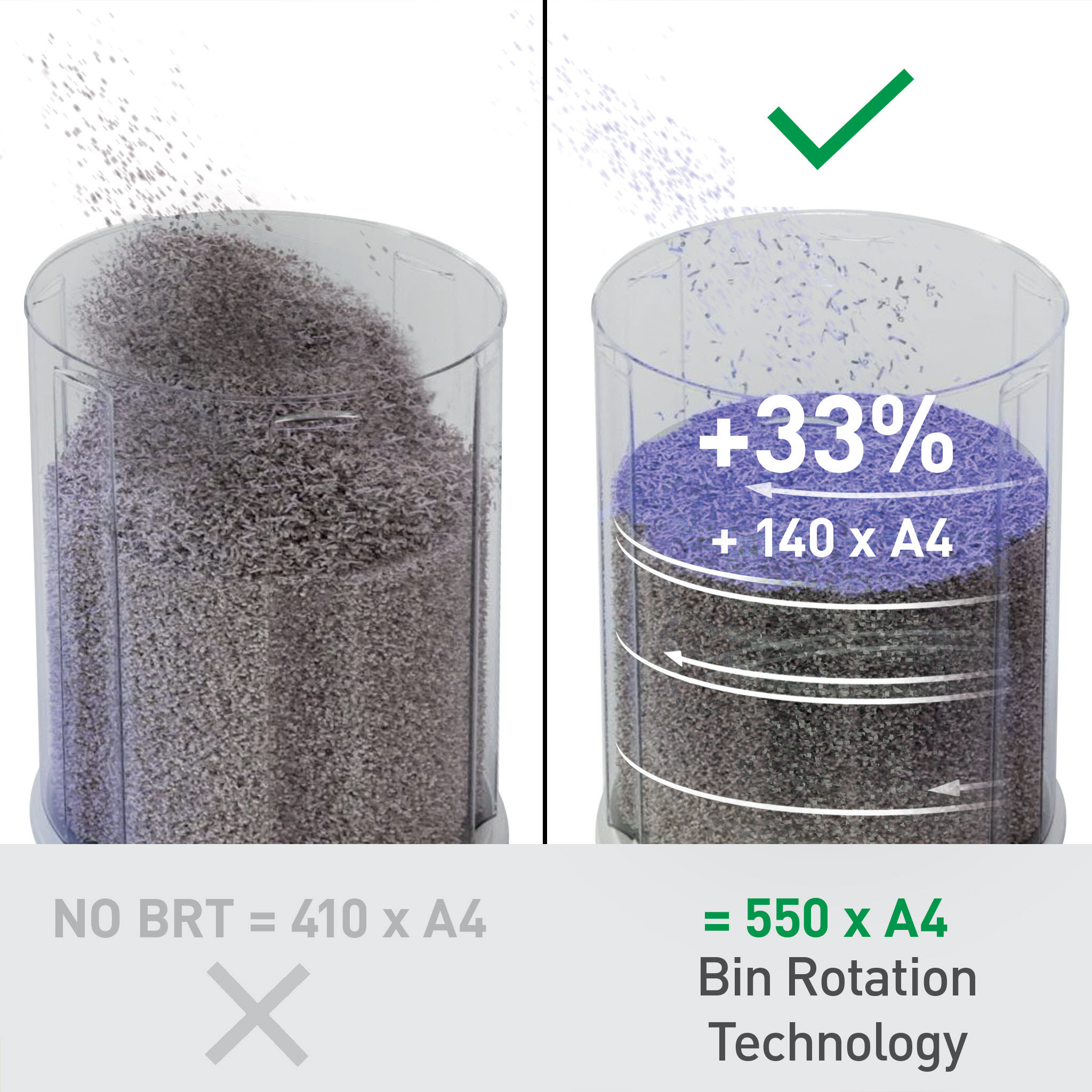 - Der grosszügige 35-Liter-Behälter fasst bis zu 550 Blatt A4-Papier, bevor er geleert werden muss; +33 % mehr Kapazität im Vergleich zu einem Behälter ohne Rotationstechnologie (+140 Blatt A4).