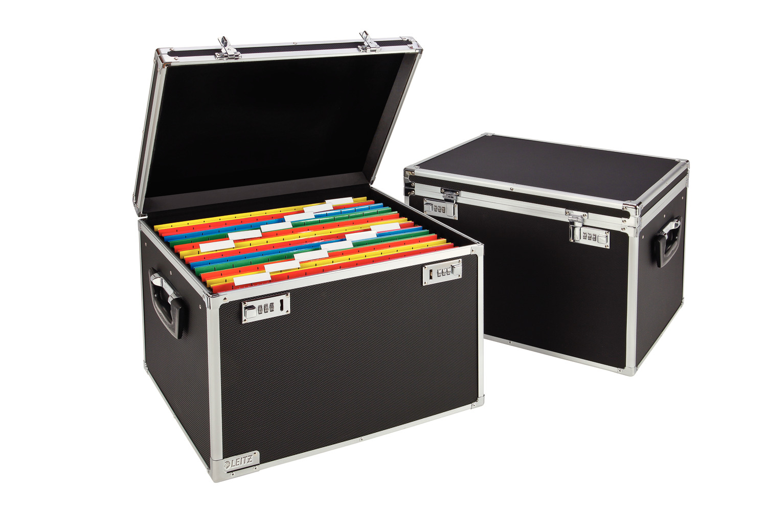 Verschliessbare Aluminium-Ablage zur Aufbewahrung von bis zu 30 Hängemappen, Ordnern oder Dokumenten. Für den Einsatz unterwegs, im Büro oder zu Hause. Tragegriffe für leichten Transport. Doppeltes Zahlenschloss. Ohne Inhalt.