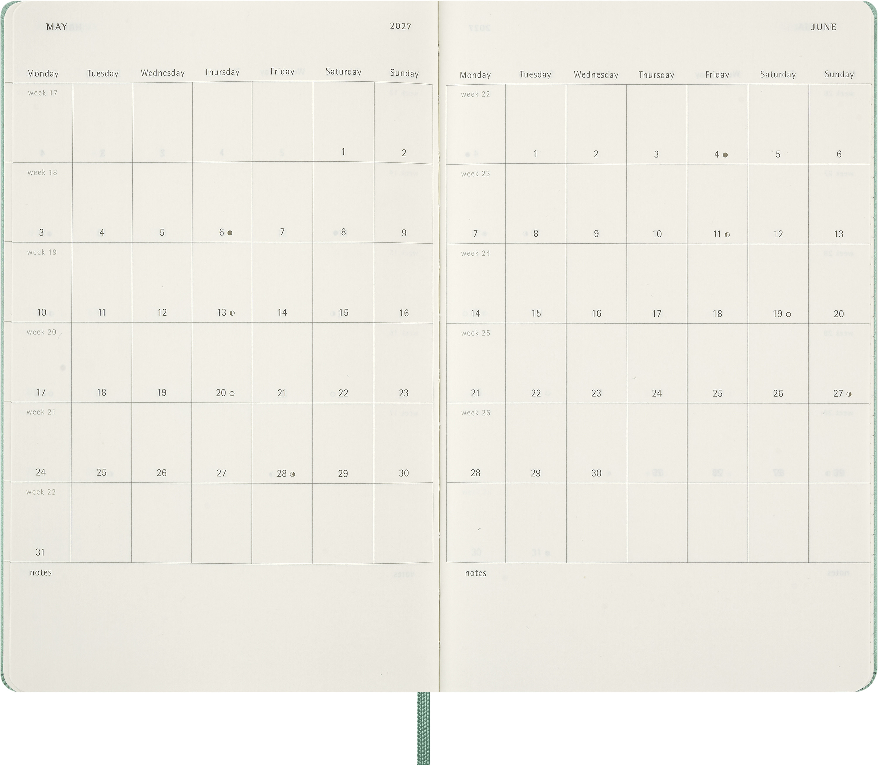 Der 18-Monate Wochen-Notizkalender von Moleskine geht von Juli bis Dezember. Mit den Wochenterminen auf der linken Seite und einer linierten rechten Seite mit Platz für Notizen und Ideen ist dieser beliebte Kalendertyp perfekt für Studenten, Lehrer und Geschäftsleute.