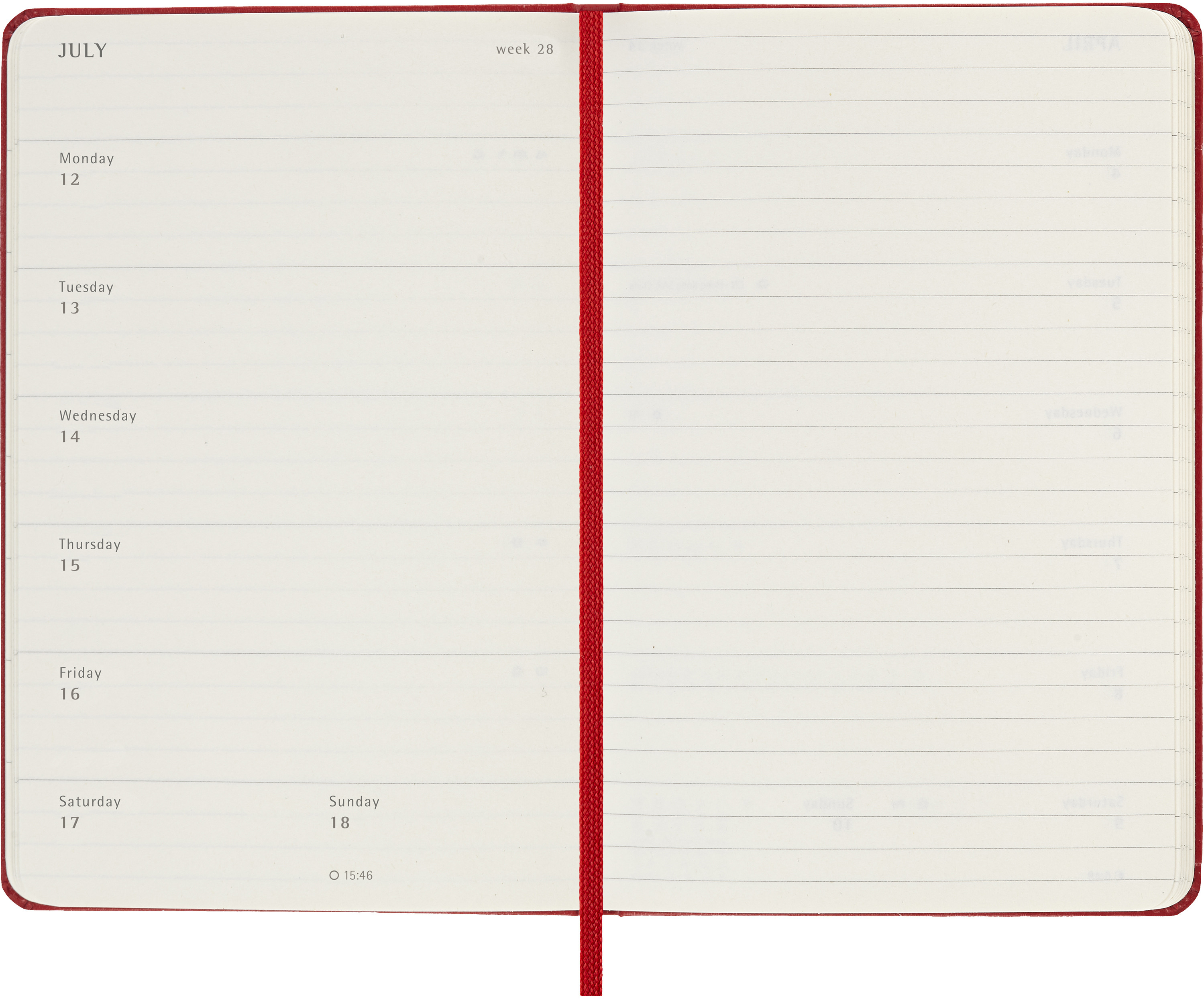 Der 18-Monate Wochen-Notizkalender von Moleskine geht von Juli bis Dezember. Mit den Wochenterminen auf der linken Seite und einer linierten rechten Seite mit Platz für Notizen und Ideen ist dieser beliebte Kalendertyp perfekt für Studenten, Lehrer und Geschäftsleute.