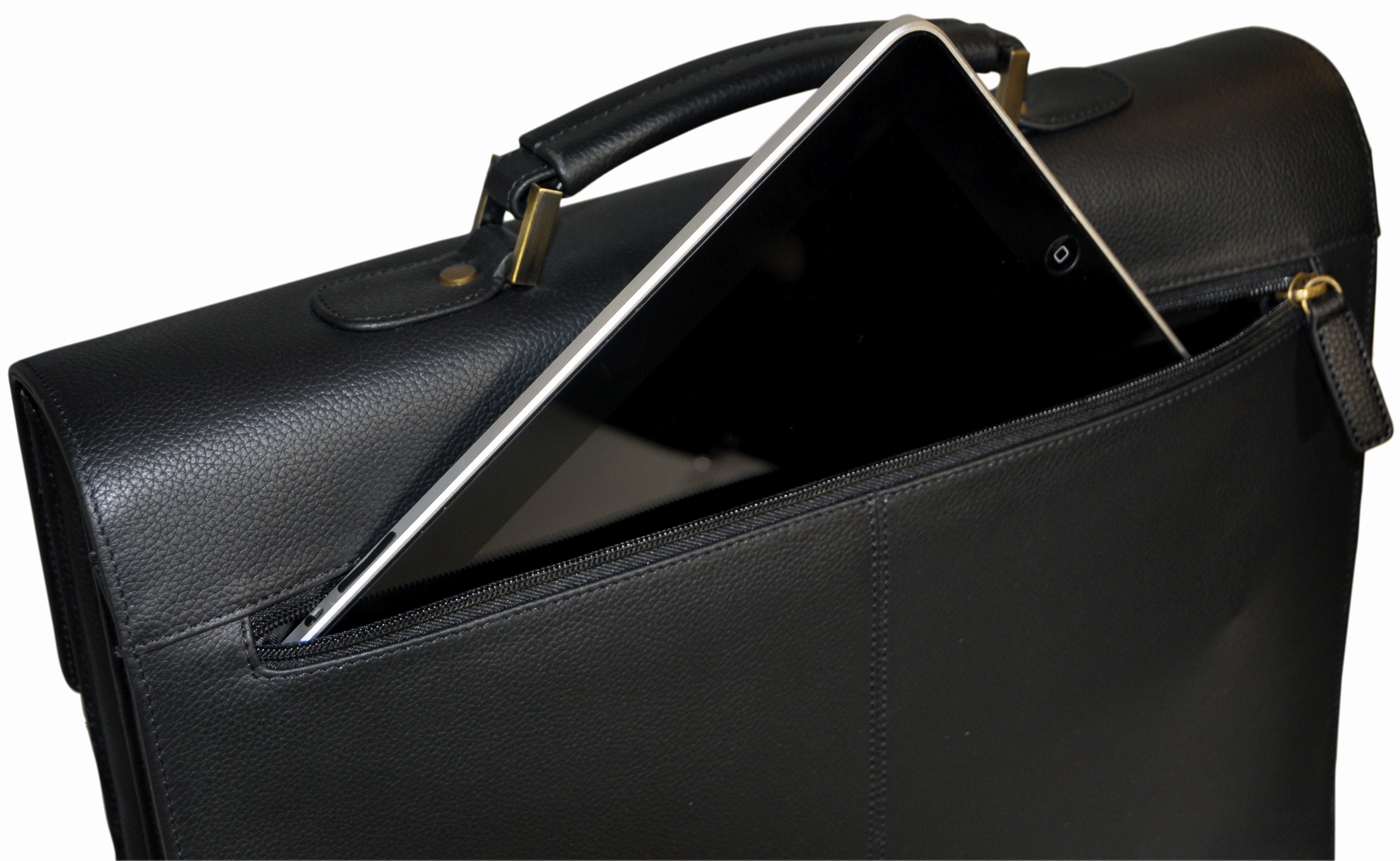 Geschäftstasche aus Leder • mit Antik-Messing-Beschlägen • abschliessbar • Reissverschluss für Tablets auf der Rückseite • Hauptbereich dreifach unterteilt • abnehmbarer Schulterriemen und Komfort-Tragegriff • grosszügiger Organizerbereich • BxHxT: 39 x 30 x 11 cm