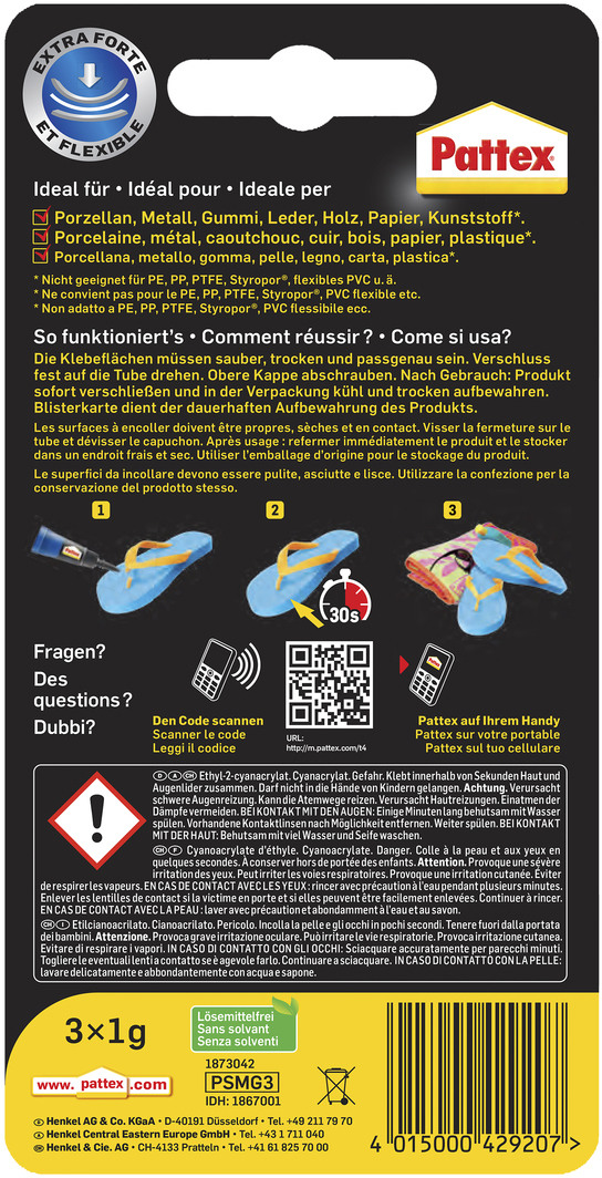 Durch seine Henkel Rezeptur mit Mikro-Gummipartikeln überzeugt Pattex Sekundenkleber Ultra Gel beim Kleben an vertikalen Flächen oder Objekten. Der Reparaturkleber mit Gelkonsistenz sorgt für starke Verklebungen ohne lästiges tropfen, sogar auf senkrechten Flächen. Die robusten Verklebungen sind vibrationsdämpfend, stoss- und wasserresistent und halten selbst schlagartige Belastungen bruchsicher aus. Mit dem flexiblen Gelkleber lassen sich viele Materialien** verkleben, wie etwa Gummi oder Leder, Holz, Keramik, viele Kunststoffe, Metall oder Stein. Ob im Haushalt, in der Werkstatt, am Auto, als Modellbaukleber oder im Aussenbereich sind vielseitige Reparaturen einfach und schnell umsetzbar.
