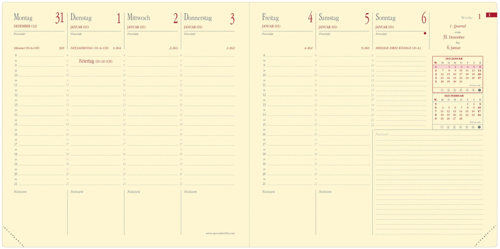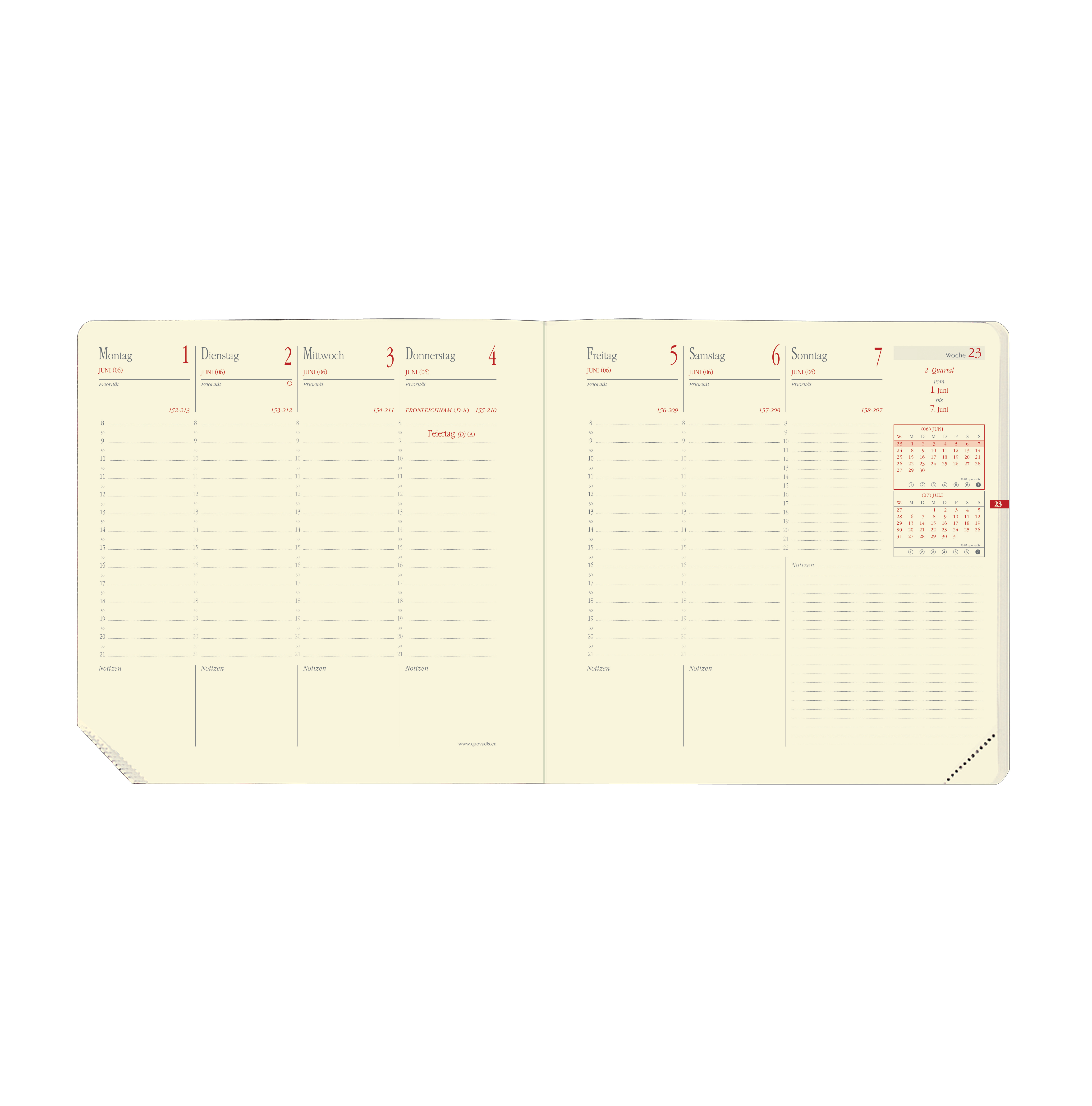 Perfektes Zeitmanagement, weniger Stress - Die Quo Vadis Büroagenda ist ein praktischer Helfer zum Planen Ihres Alltags. Da jeweils eine Woche auf einer Doppelseite sichtbar ist, haben Sie Ihre Woche stets im Griff.