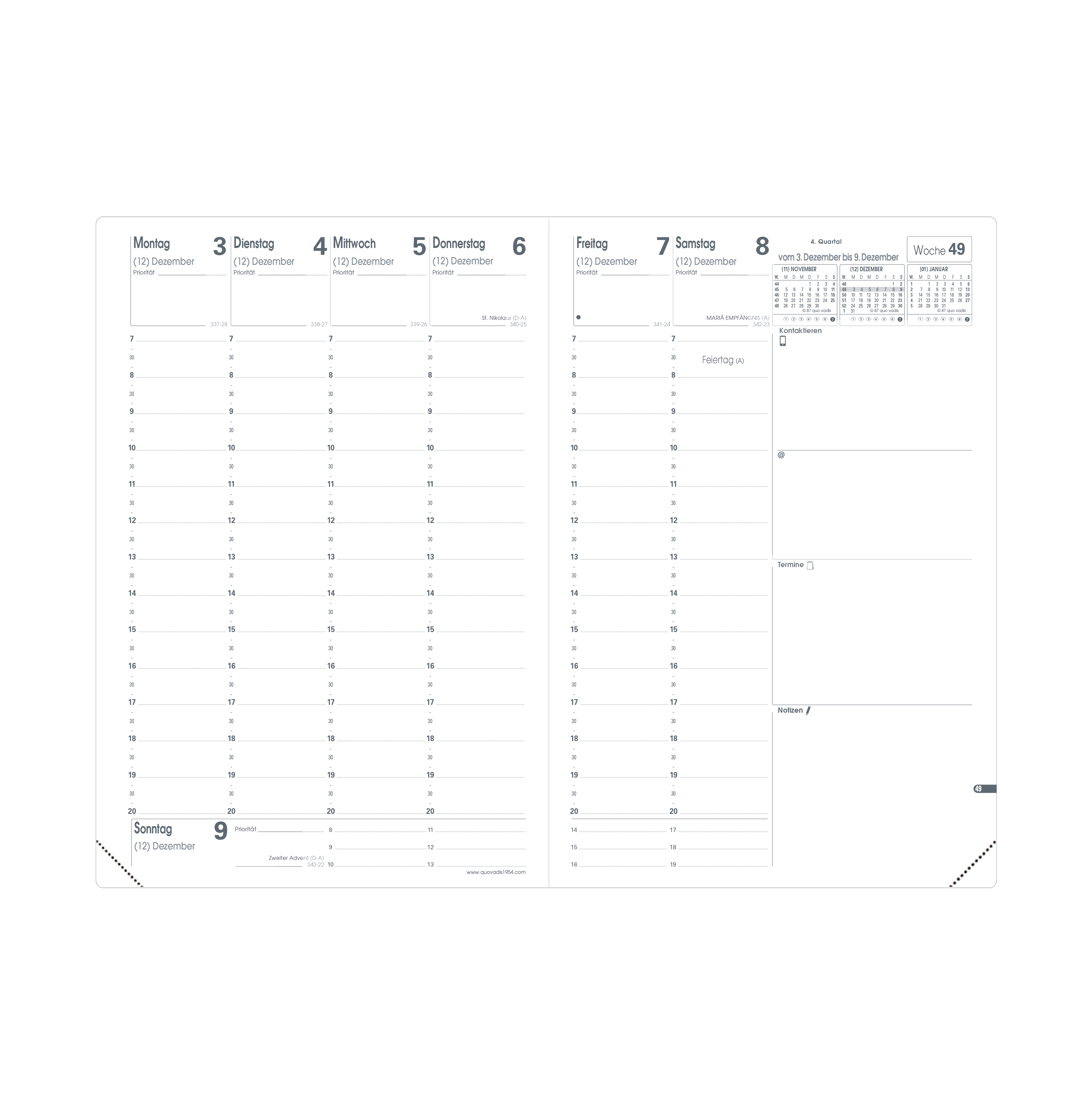Perfektes Zeitmanagement, weniger Stress - Die Quo Vadis Büroagenda ist ein praktischer Helfer zum Planen Ihres Alltags. Da jeweils eine Woche auf einer Doppelseite sichtbar ist, haben Sie Ihre Woche stets im Griff.